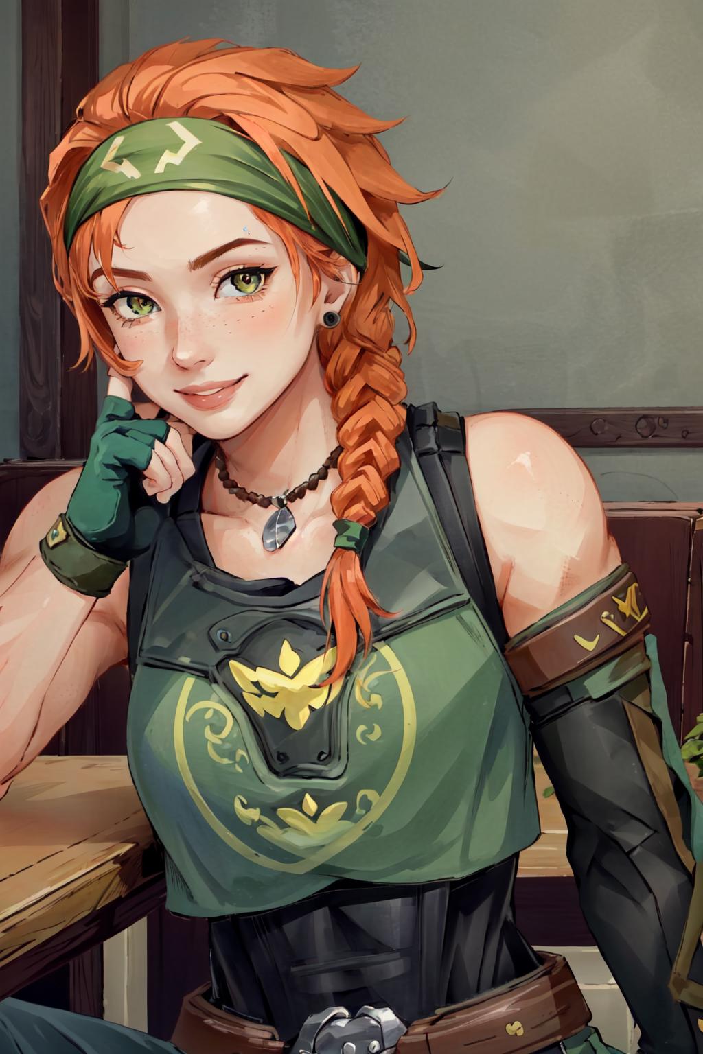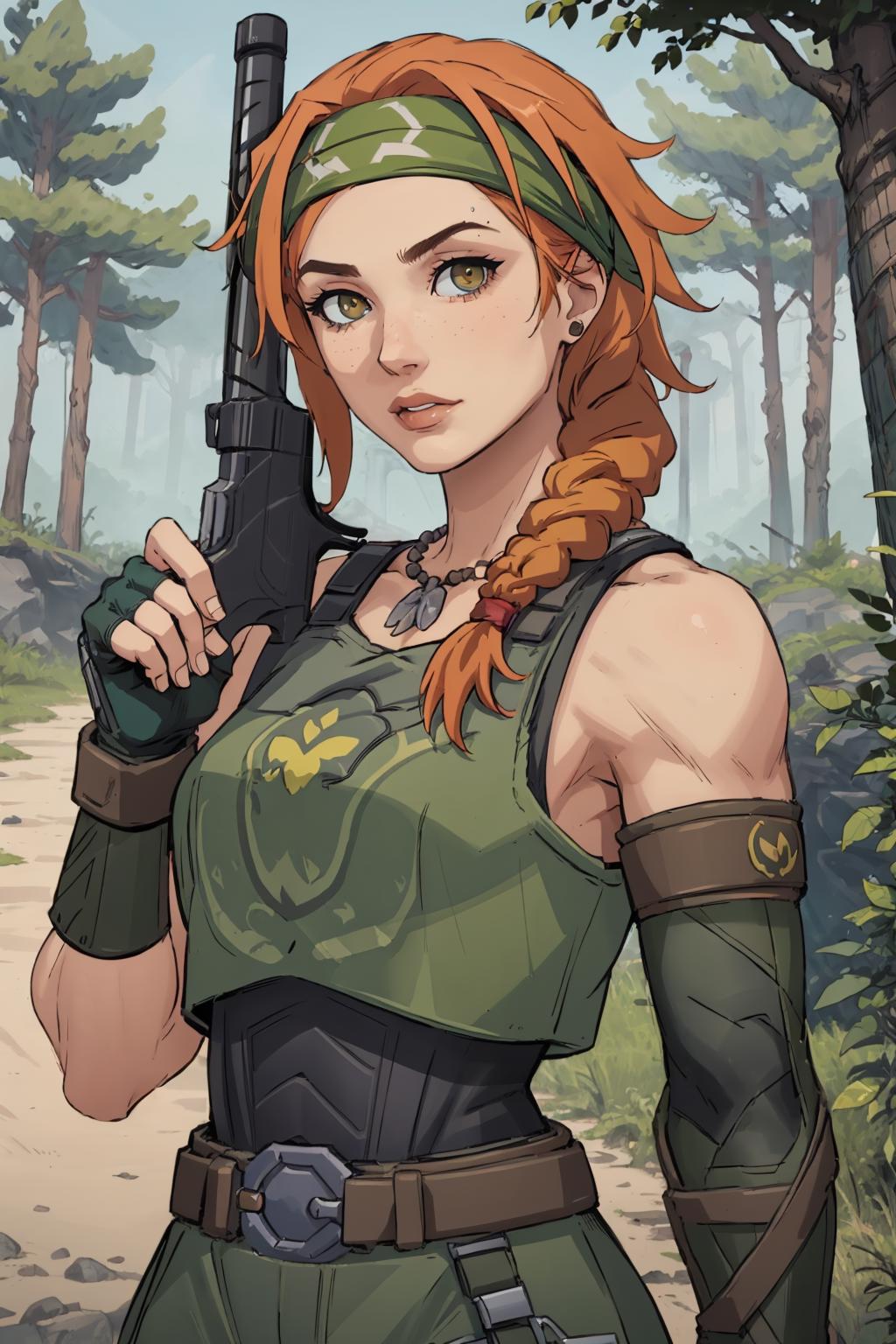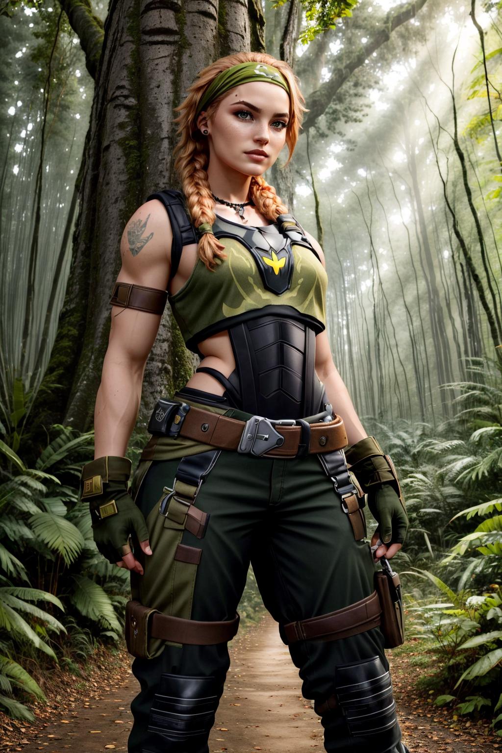 optional tags: headband, fingerless gloves, body armor, single elbow glove, belt, pants, crop top