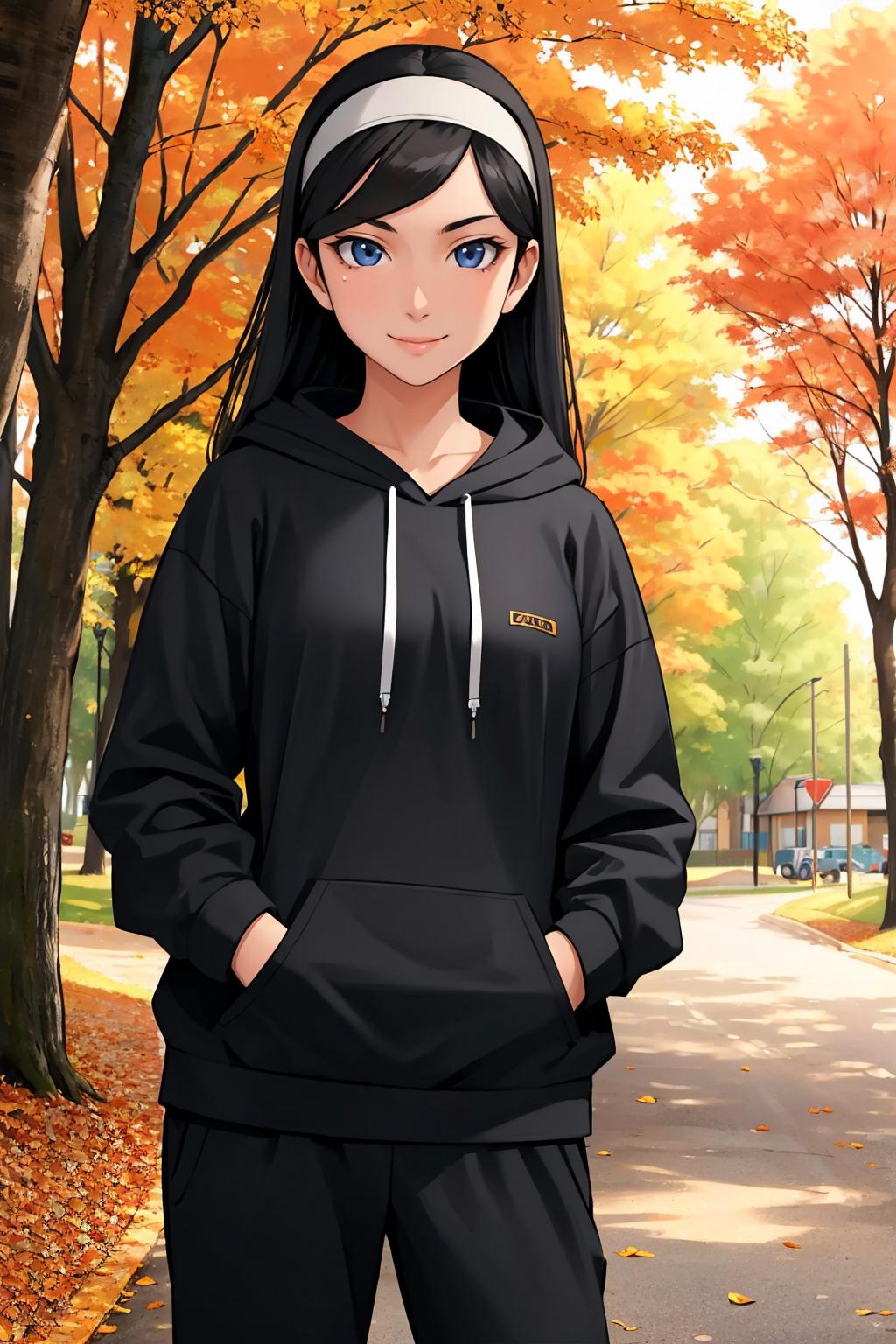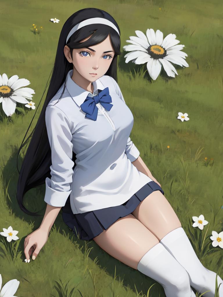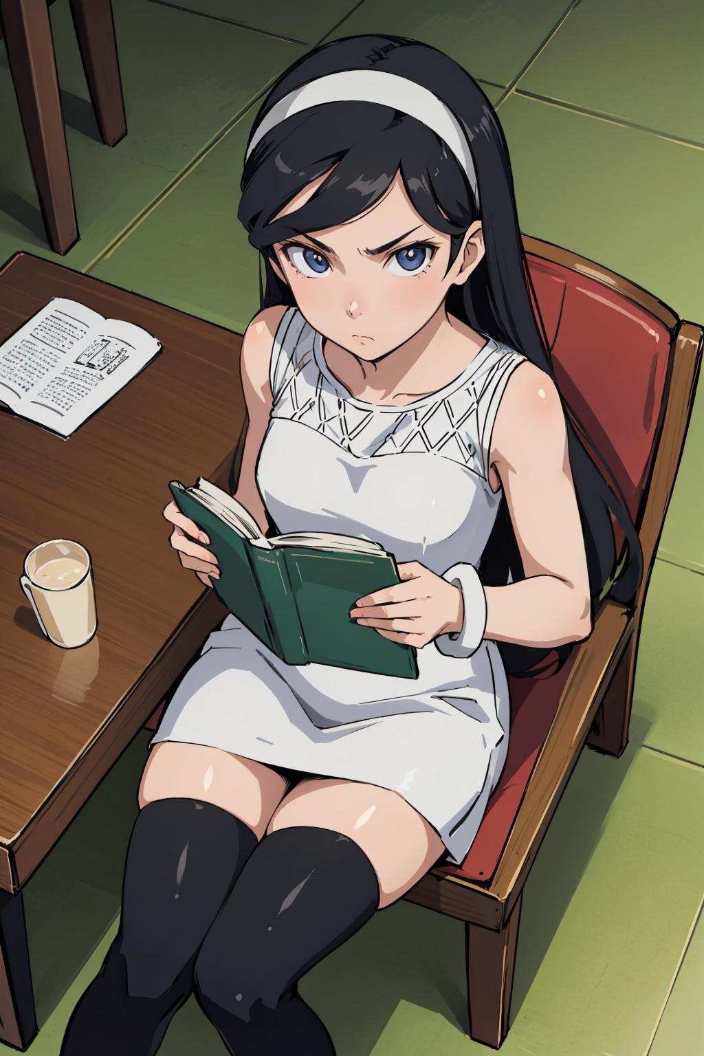 Add "hairband, white dress, bracelet, black thighhighs" for her typical look.