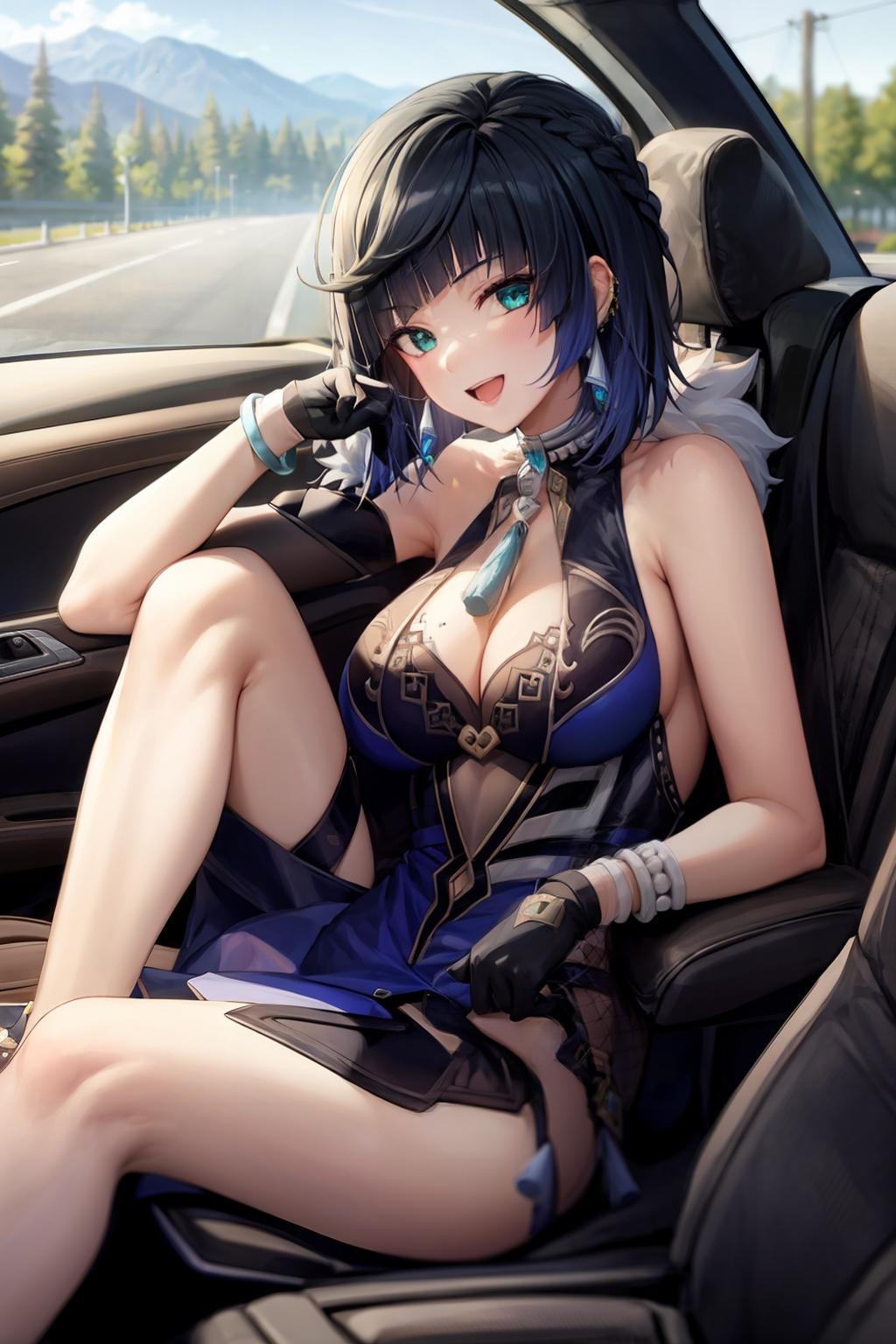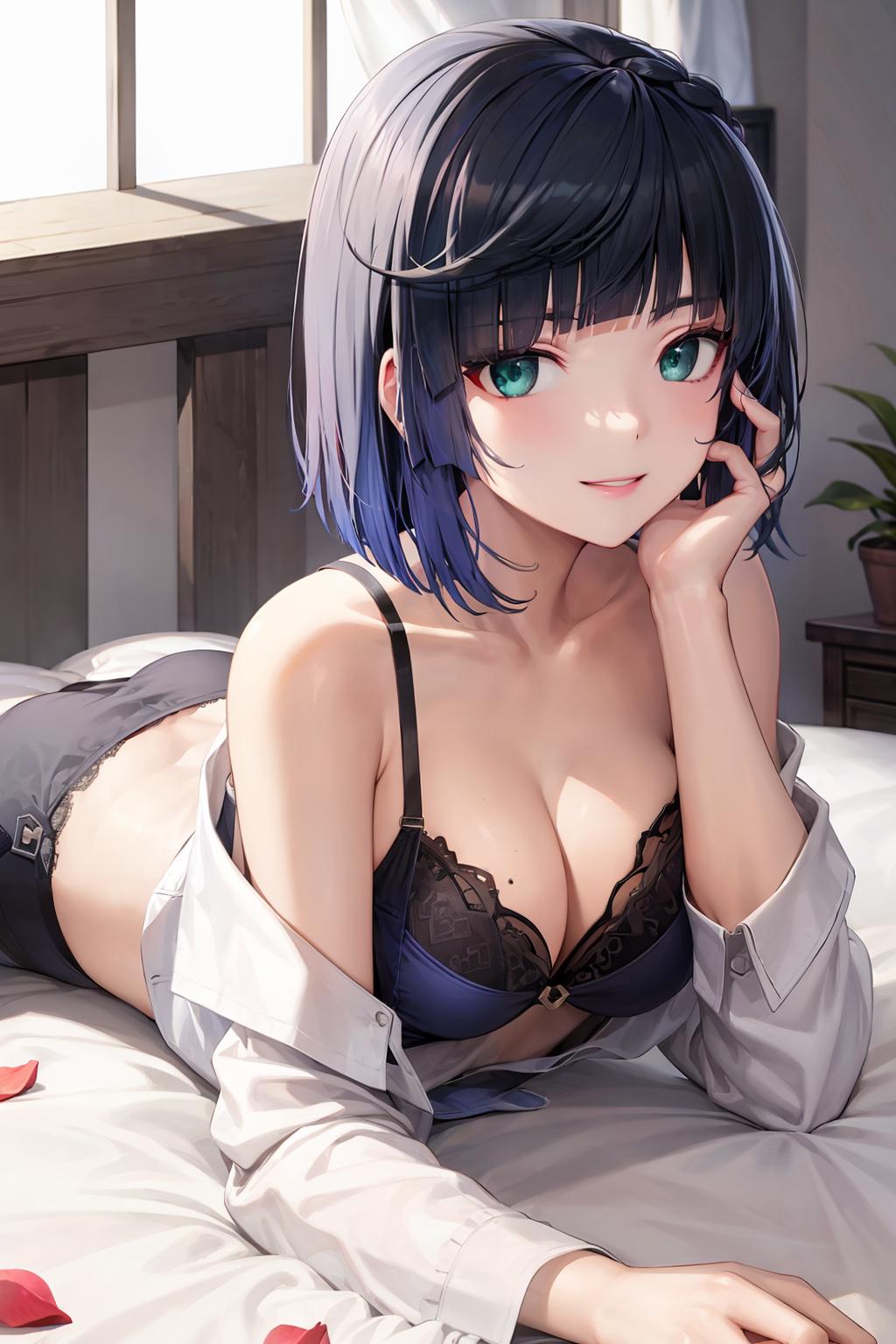 1girl,vision \(genshin impact\), blue hair,short hair, green eyes,earrings,dice,jewelry,neck ring,mismatched gloves, , cleavage cutout,fur-trimmed jacket, jacket on shoulders, bare shoulders, dice, dress, tassel, mole on breast, tight pants,pelvic curtain, single elbow glove,sleeveless, bracelet, pants,