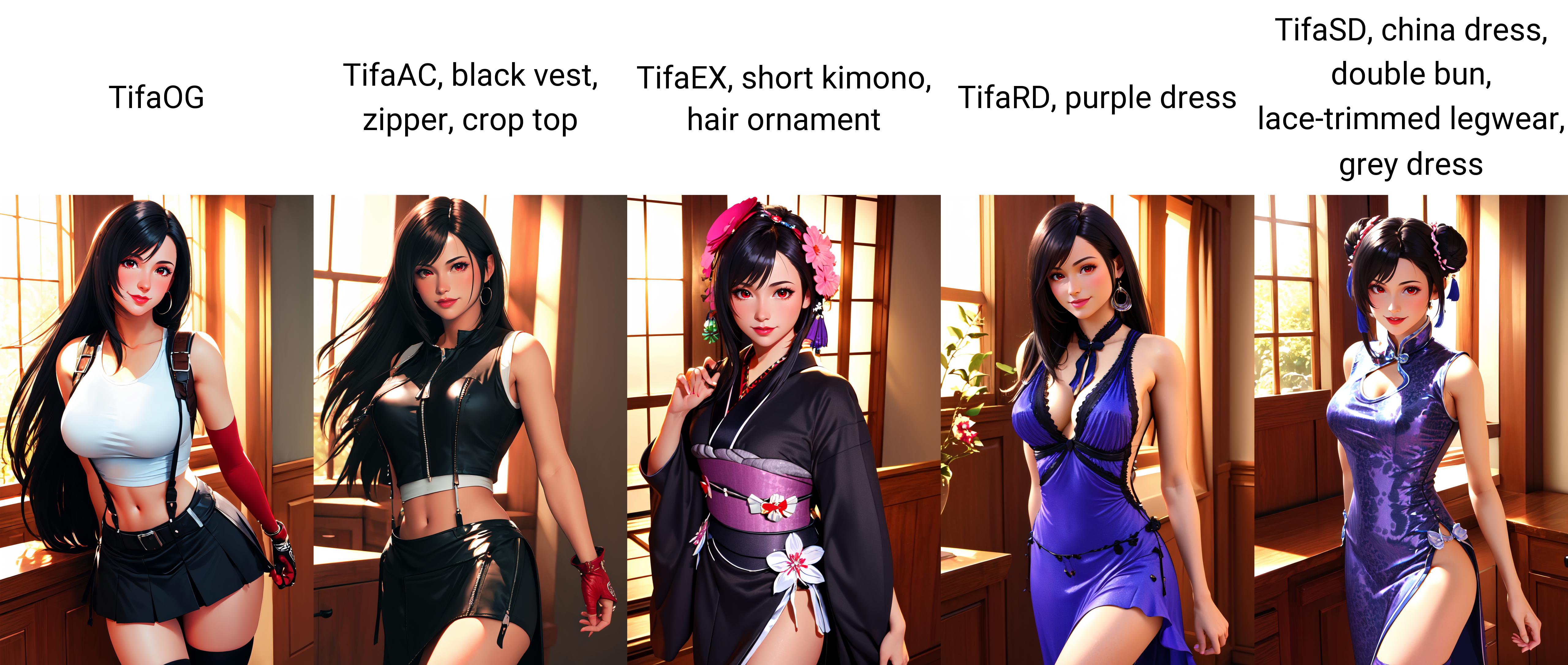 Weight can go from 0.6 up to 1.0. I recommend 1. Works with almost every Style, Concept and Photorealistic Models. Can be pretty unstable, because it includes 5 Outfit's and is lit 1MB. TifaAC does not 100% replicate her Outfit.