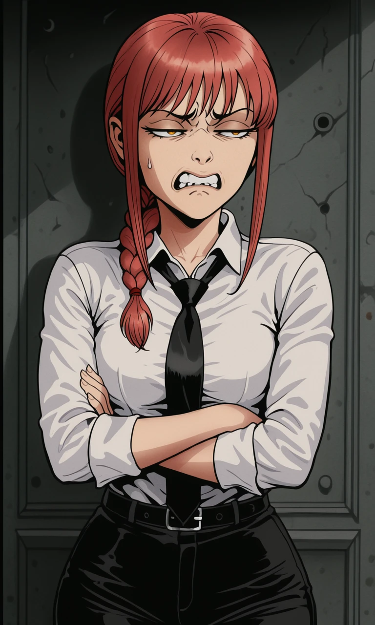 cringe, half-closed eyes, clenched teeth