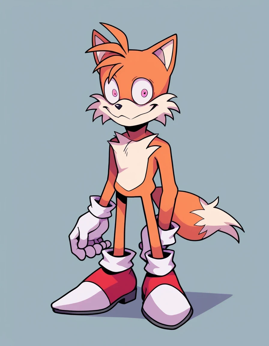 Secret_Histories_TailsFNF, pink eyes, gloves, 1boy, animal ears, standing, tail, shoes, white gloves, fox tail, red footwear, furry, wide-eyed, furry male, body fur, white fur, constricted pupils, two tails, animal nose, flat color, two-tone fur, fox boy, orange fur, red shoes, resembling tails, mobian, sonic the hedgehog