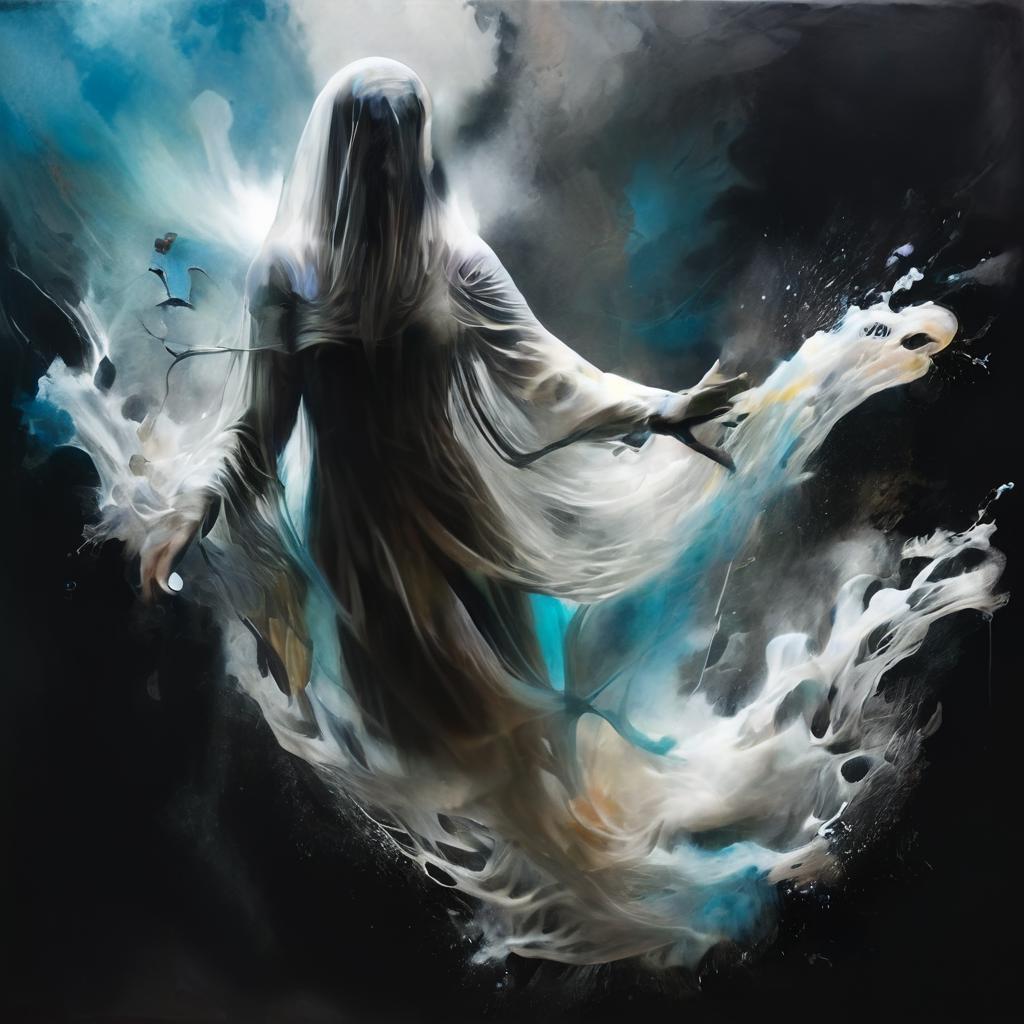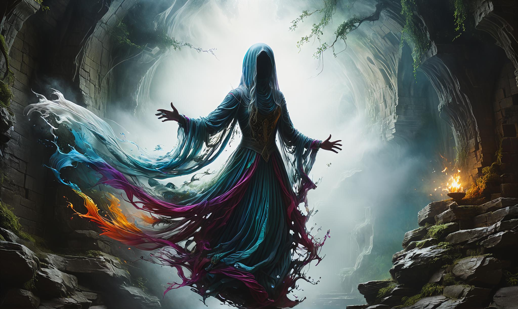 banshee, cloak, facing away, flying, , hood, long hair, looking at viewer, open mouth, outstretched arms, screaming, skeletal, spread arms, standing, teeth, very long hair