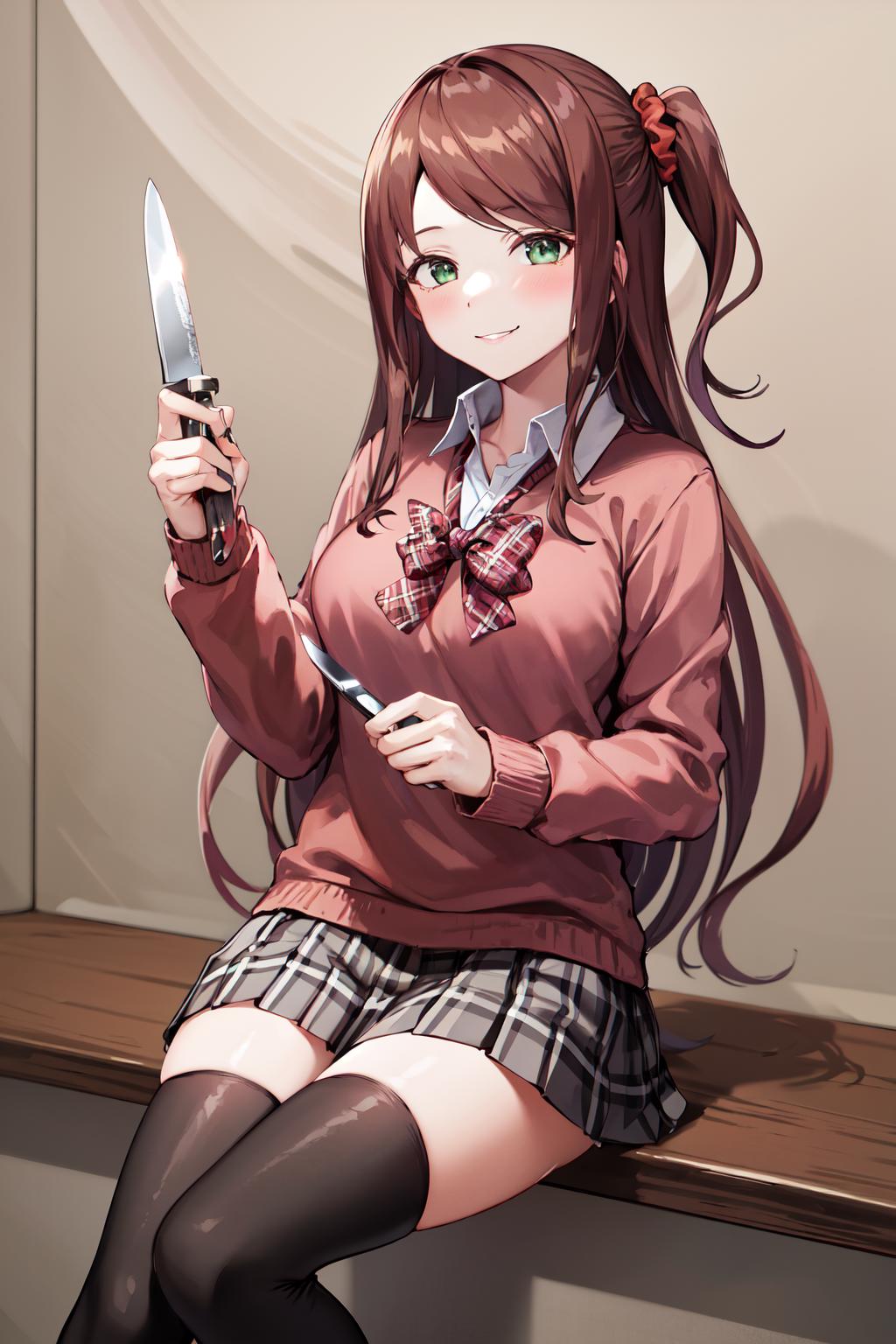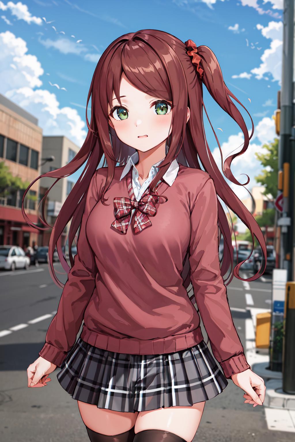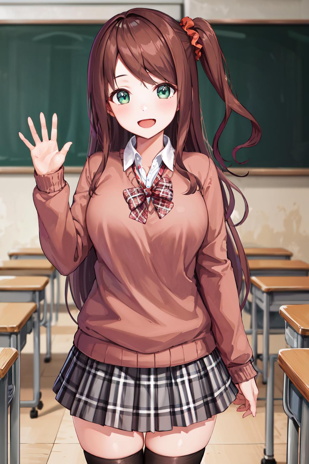 hmyouko, black thighhighs, pleated skirt, plaid skirt, school uniform, one side up, bowtie, sweater, white shirt, hair scrunchie, miniskirt