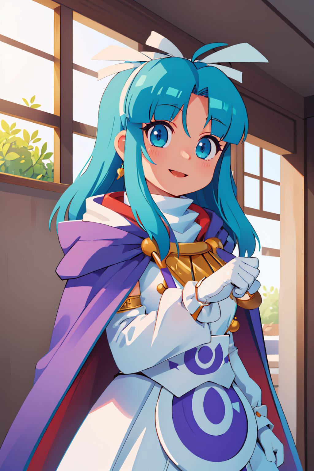 Add "hair ribbon, cape, white gloves, long dress, purple trim" for her typical look.