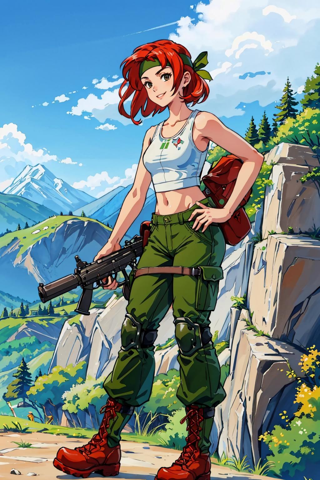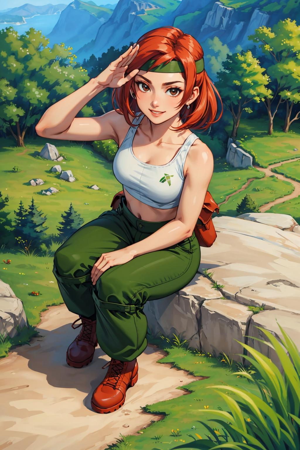 Add "green headband, white tank top, midriff, green pants, pouch, combat boots" for her typical look.