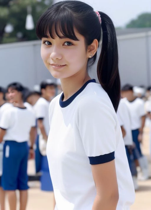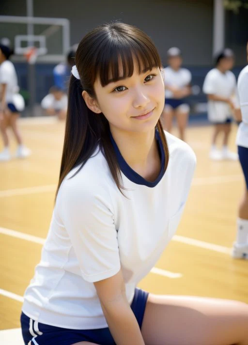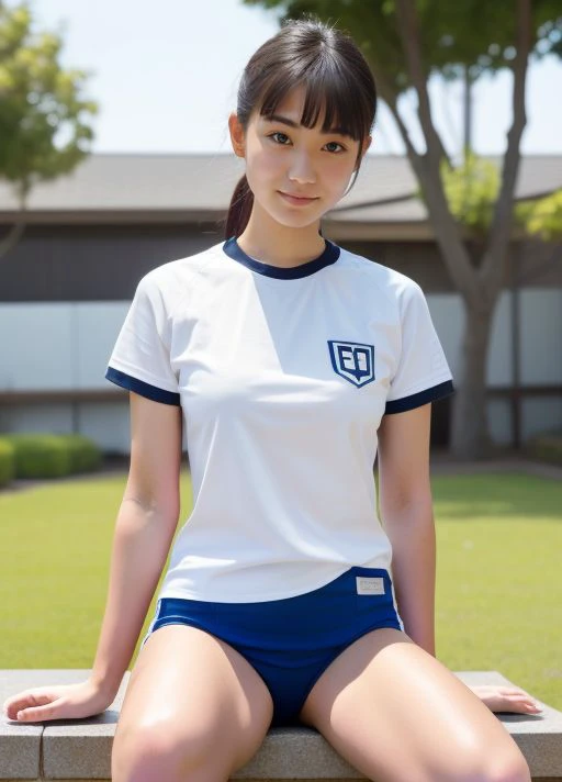 1girl, shirt, solo, gym uniform, realistic, white shirt, buruma