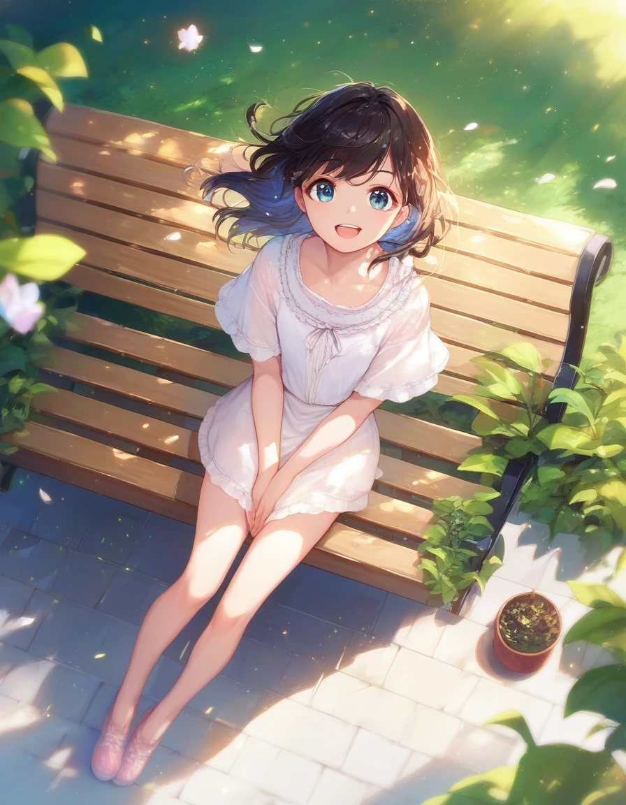 score_9, score_8_up,score_7_up,score_6_up, a girl sitting on a park bench, dutch angle, smile, open mouth, <lora:tanabae_kyou_style_pony6_v1-000014:1>