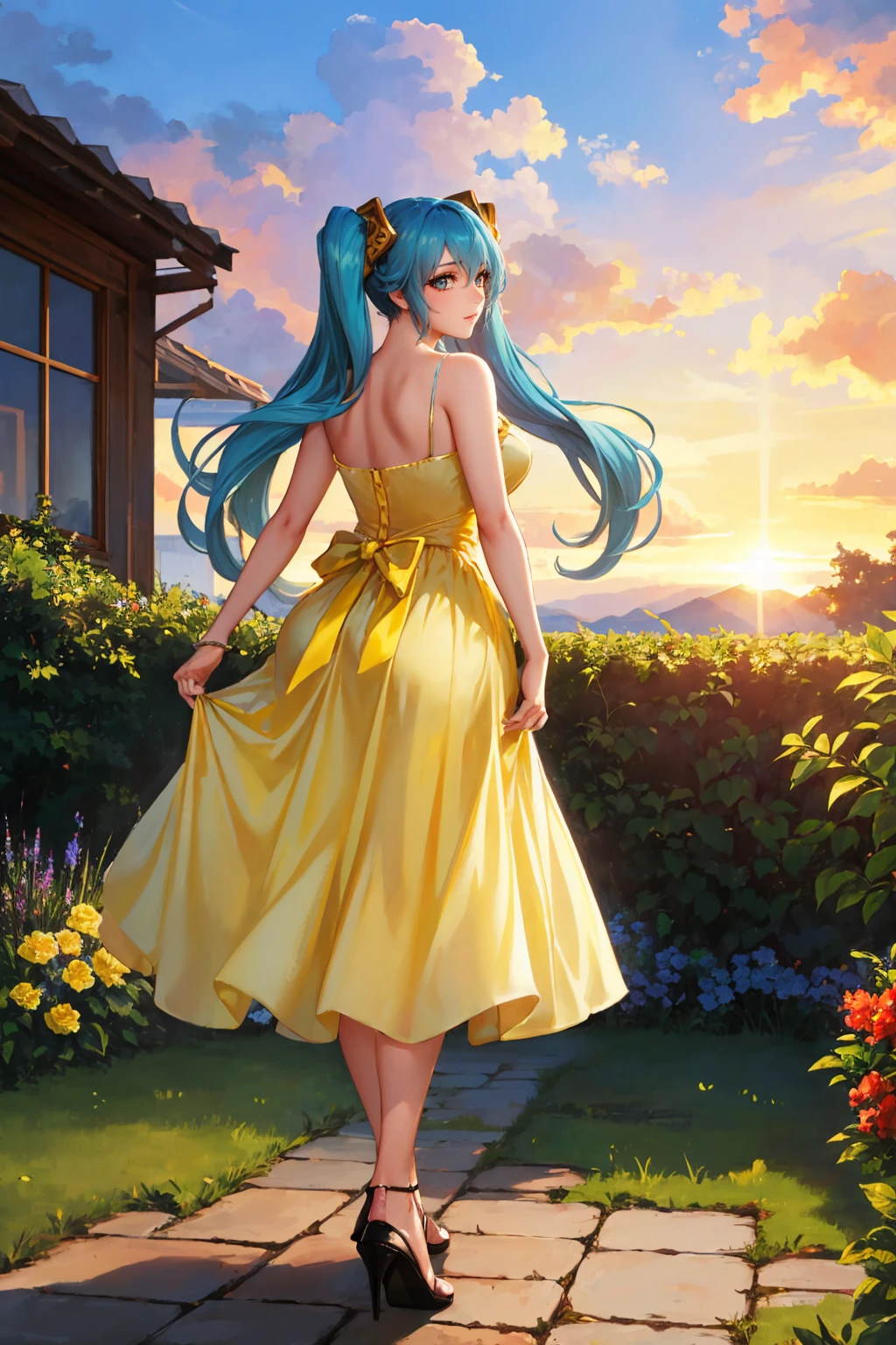 off-shoulder, blue and green dress, cleavage, wide sleeves, gold trim