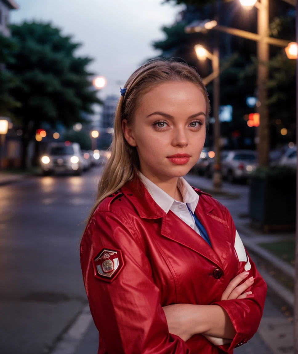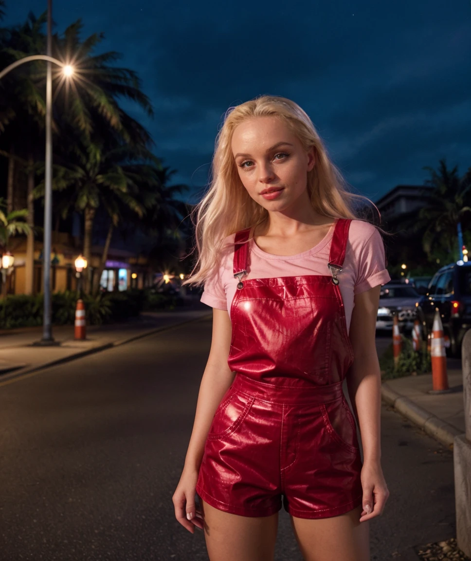 inematic photo , <lora:quiron_SilviaSaintYoung_v1350_Lora:0.77> SilviasaintYoungQuiron, 1girl, realistic, lips, arm at side , (night street) , denim dress in shades of blue . 35mm photograph, film, bokeh, professional, 4k, highly detailed