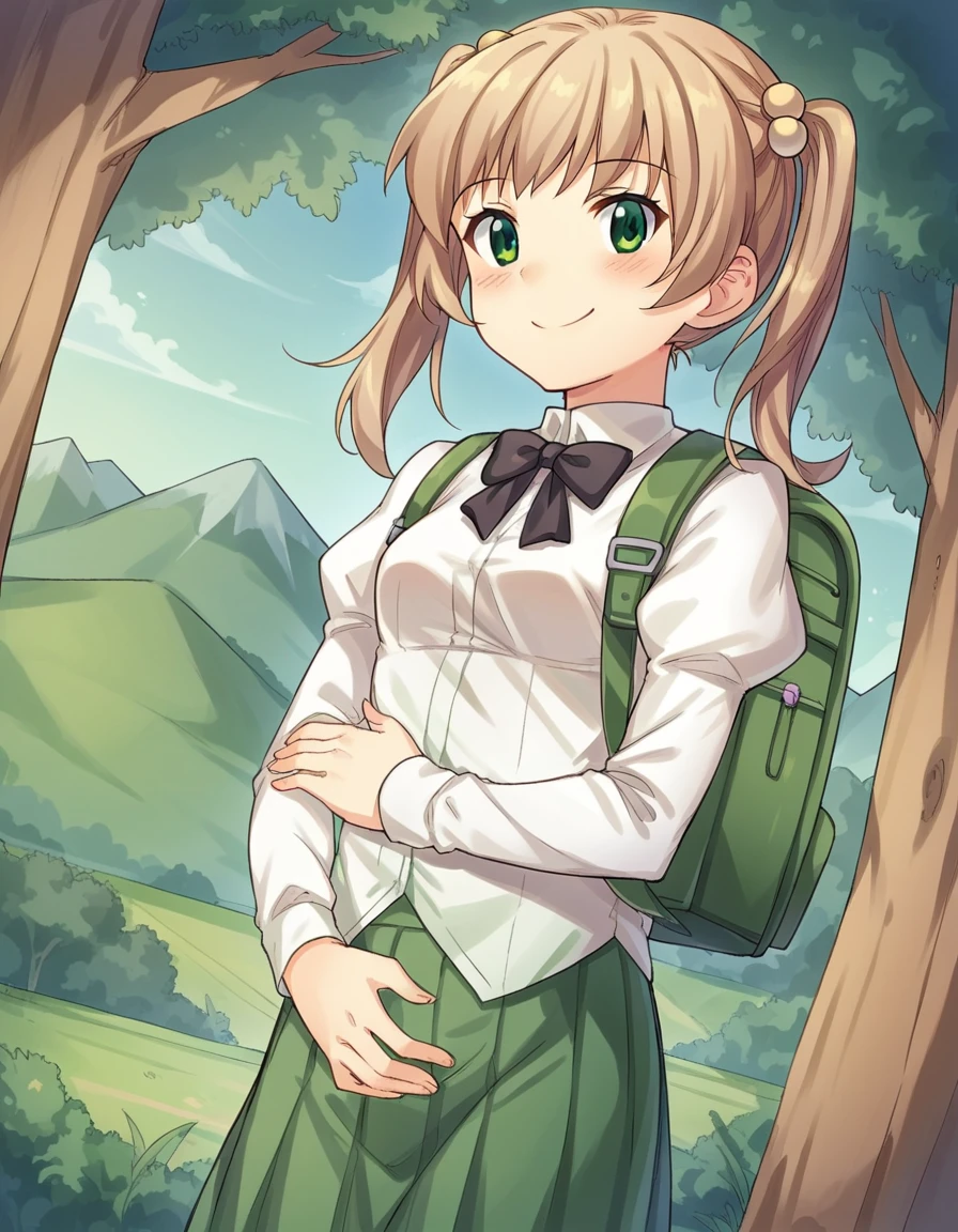 emi ibarazaki, long hair, brown hair, green eyes, hair ornament, twintails, hair bobbles,