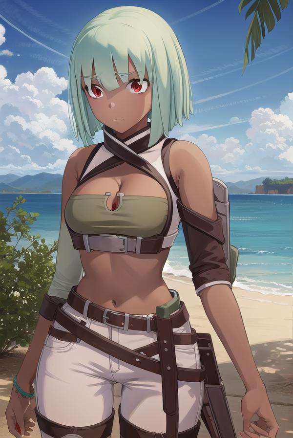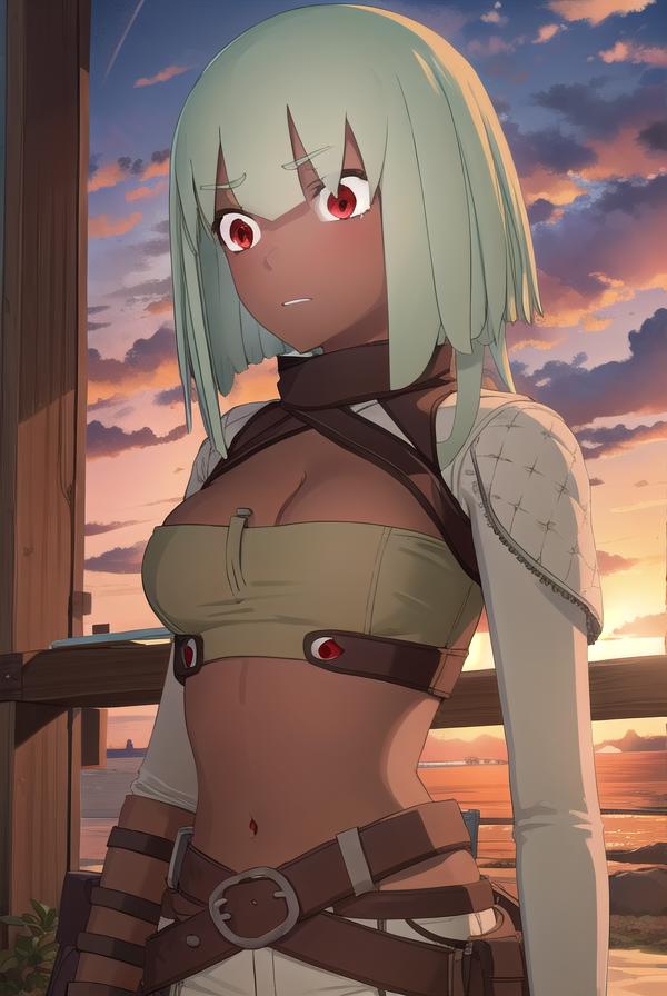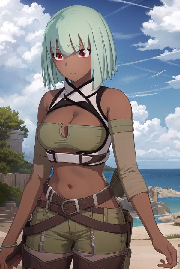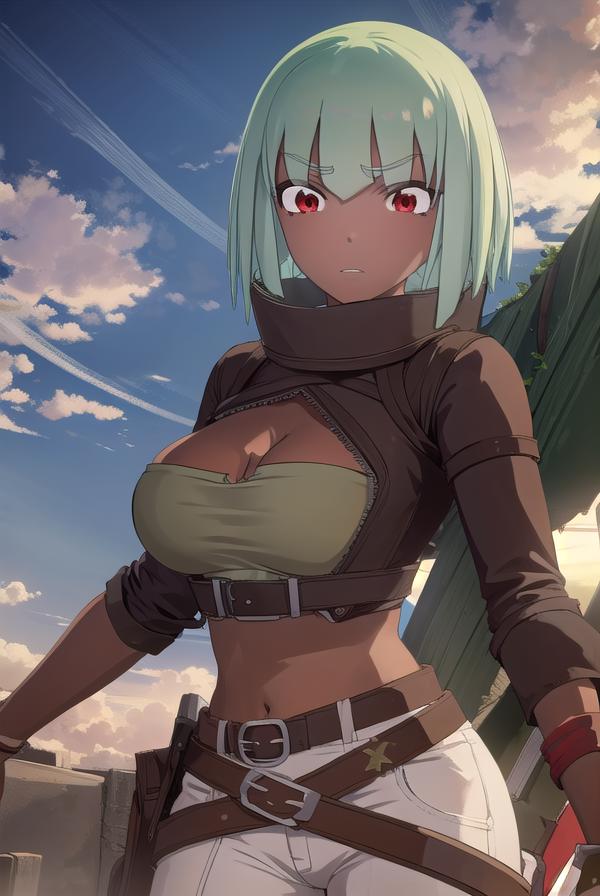 emerald sustrai, short hair, (red eyes:1.5), green hair, dark skin, dark-skinned female,