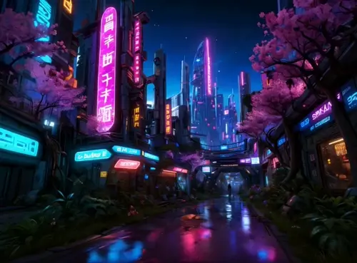 Chế độ xem thành phố neon tương lai không có con người, được trang trí với những cánh hoa anh đào thổi trong gió. Dấu nhắc và kích thước hình ảnh bắt đầu có thể tùy chỉnh, Thời lượng 5 giây.