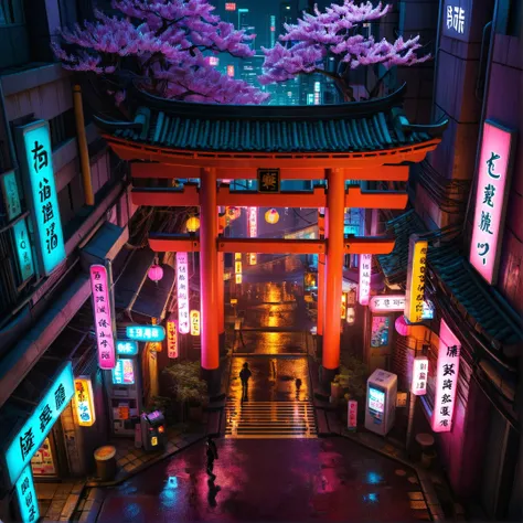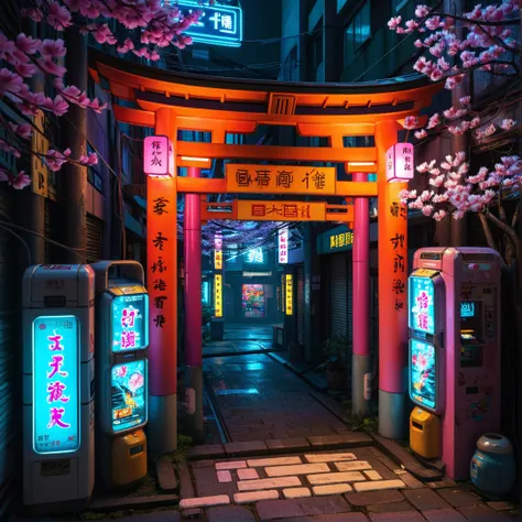 Cổng torii ẩn trong góc thành phố liminale, nơi có hoa anh đào nở vào mùa xuân
