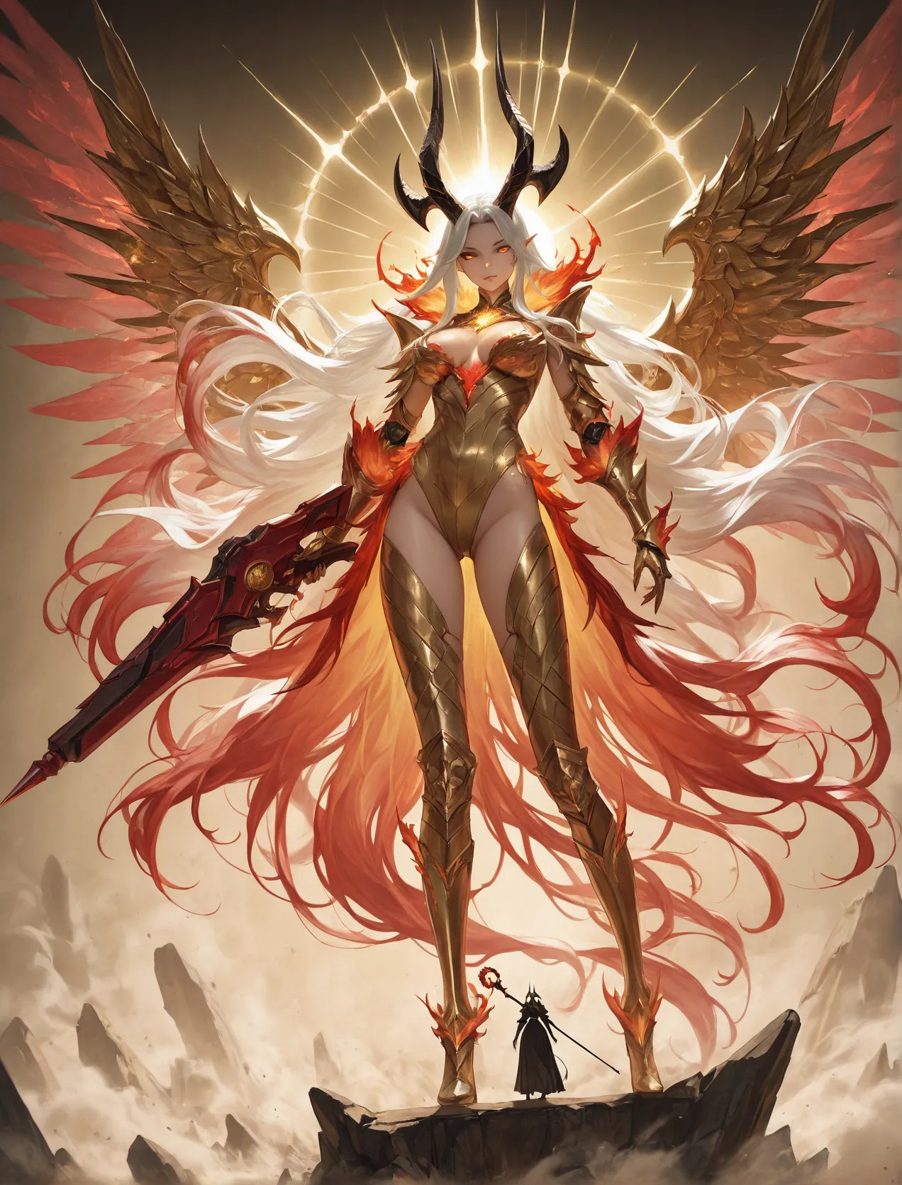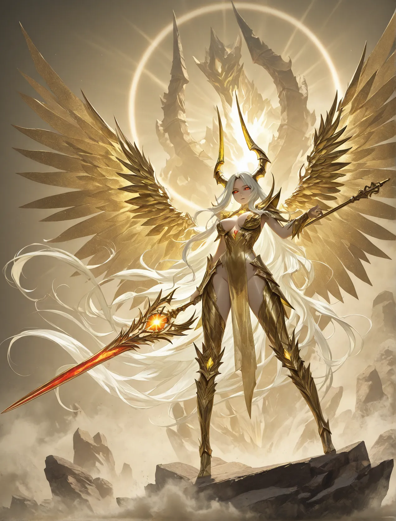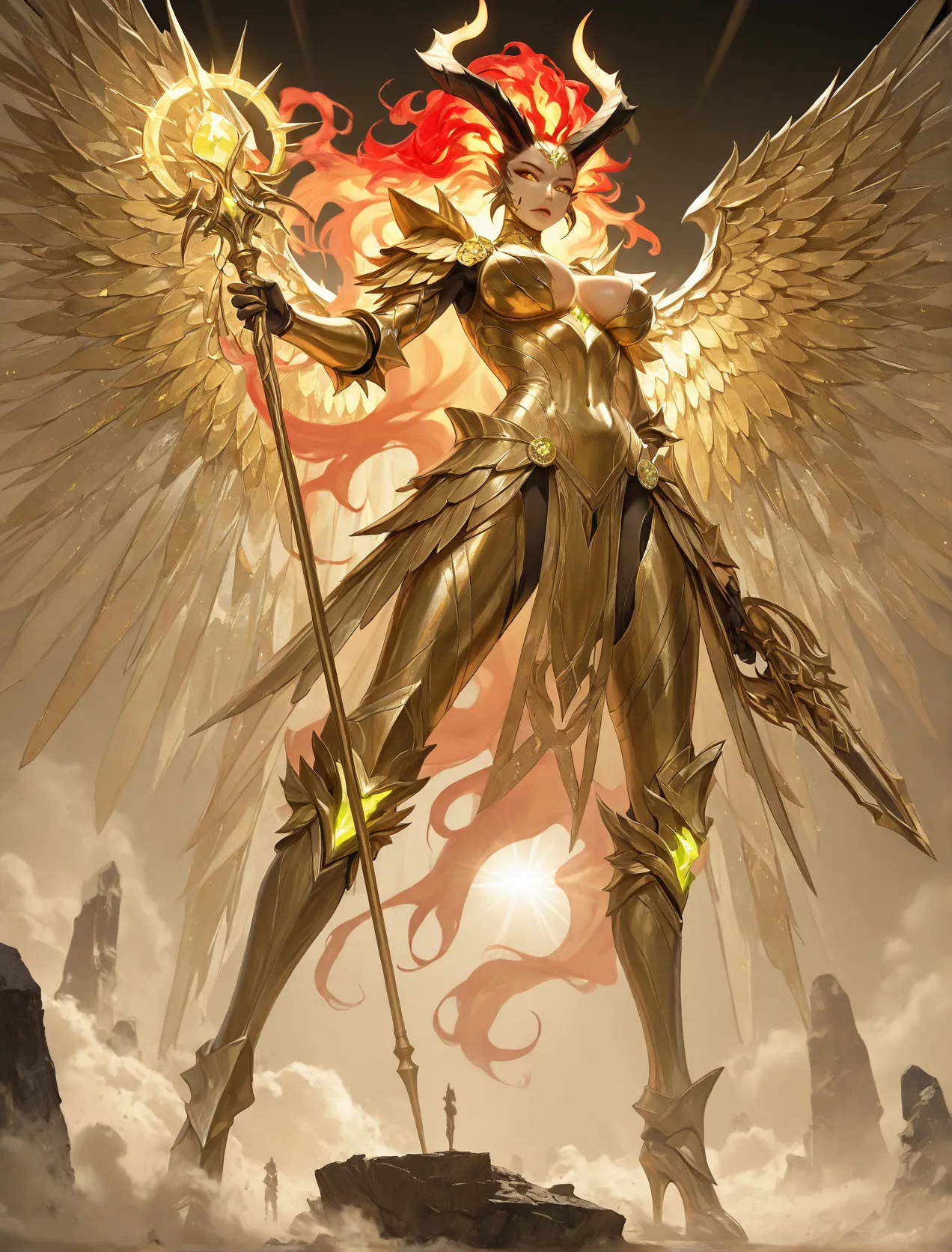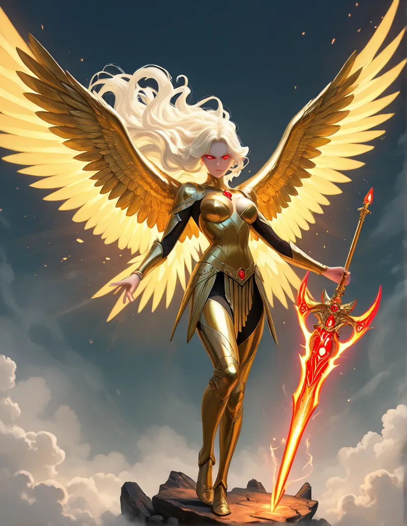cánh: large, majestic golden cánh with a feathery texture and a radiant glow. Đảm bảo sự biến đổi trong các tư thế cánh (tràn rộng, được gấp một phần).
