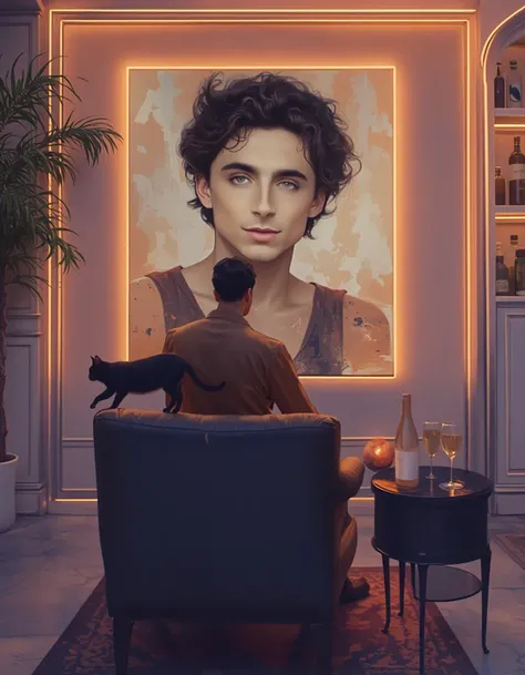 Ngồi trên ghế sofa với một con mèo đen, nhìn chằm chằm vào bức tranh dầu khung neon lớn của mình trong một không gian thanh lịch, phòng khách nghệ thuật.