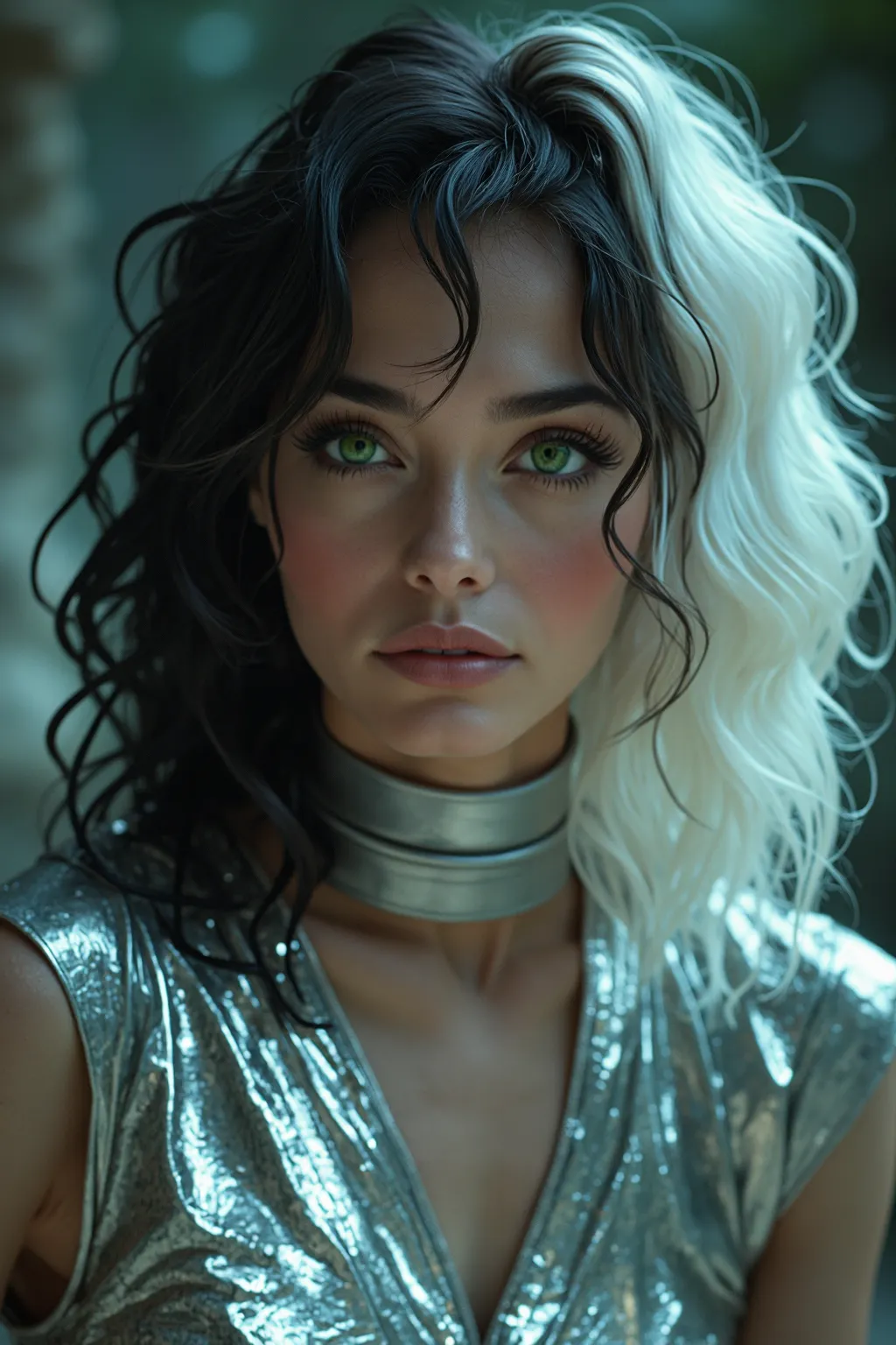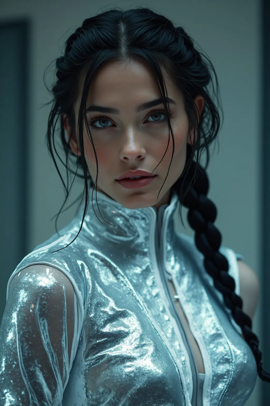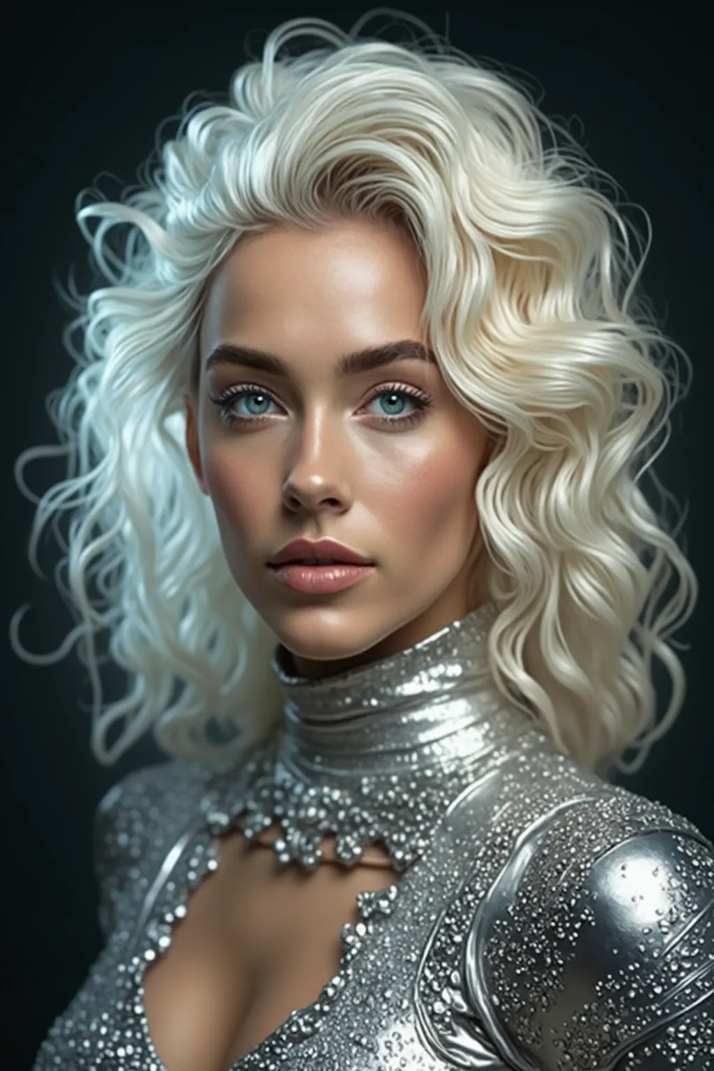 A picture of a girl,Generate a portrait photo of a silver stage costume