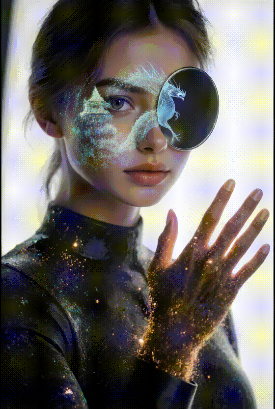 Generate AI video from an image:Transformation into a surreal VR particle girl