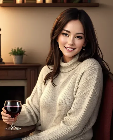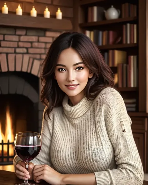 She is wearing a cozy, light beige or off-white turtleneck sweater with a textured knit. Her complexion appears fair and her features are delicate. In her right hand, she holds a clear wine glass filled with a deep red liquid, likely red wine. The background is softly blurred, suggesting a warm and comfortable indoor setting with a fireplace visible in the distance, casting a gentle glow.