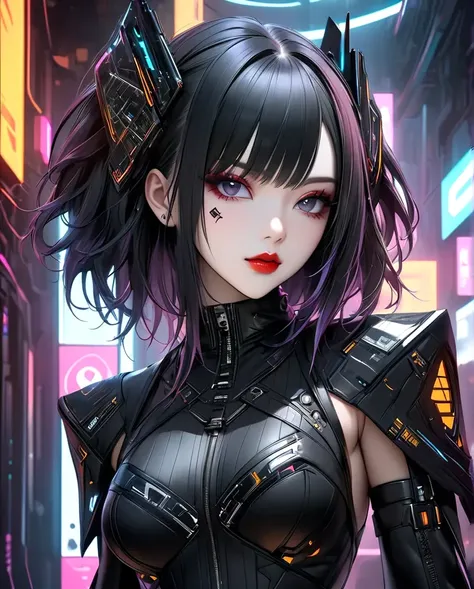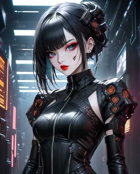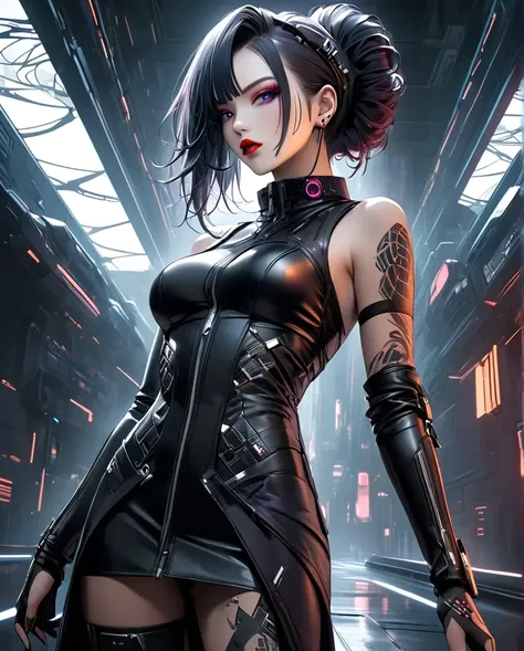 Character: A striking woman with sleek black hair styled in intricate, futuristic buns. She has captivating eyes with dramatic red eye makeup, a bold red lipstick, and a serene yet intense expression. Her overall appearance is a fusion of elegance and danger.