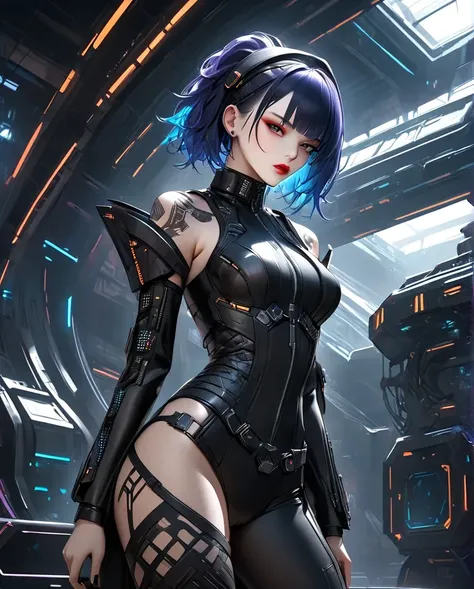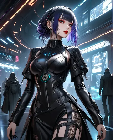 Trigger Words: cyberpunk assassin, futuristic fashion, black leather suit, red eye makeup, high-tech accessories, sleek black hair, neon city, sci-fi style
