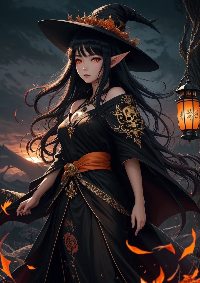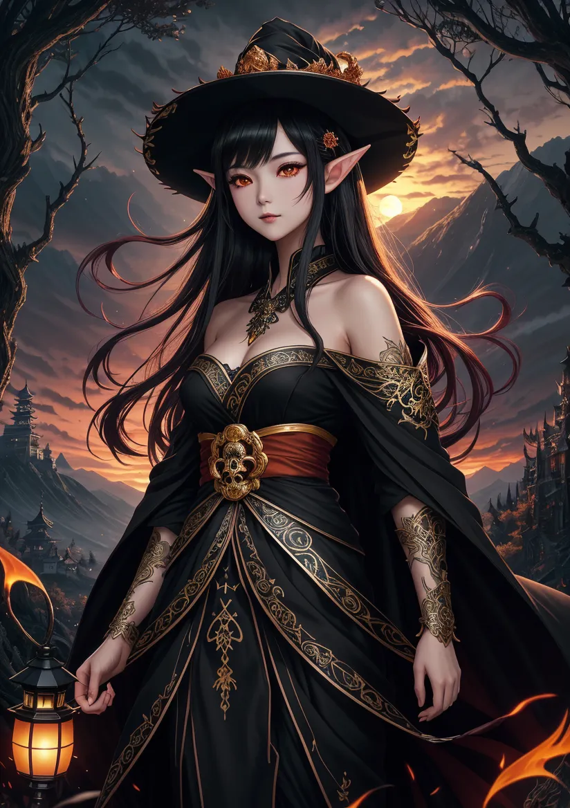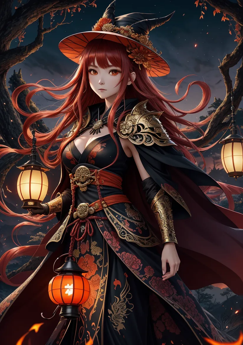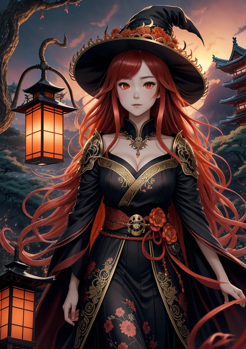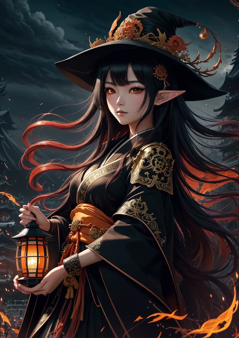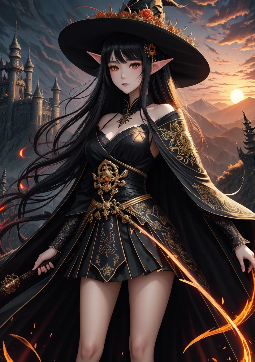 Outfit & Armor: She is clad in an elaborate, high-fantasy outfit and Yukata Witch style. The attire is a mix of black and crimson, with intricate golden armor plates on her shoulders, arms, and corset. The dress features high slits, adding to the dynamic and elegant look. A flowing red cape adds a sense of grandeur.