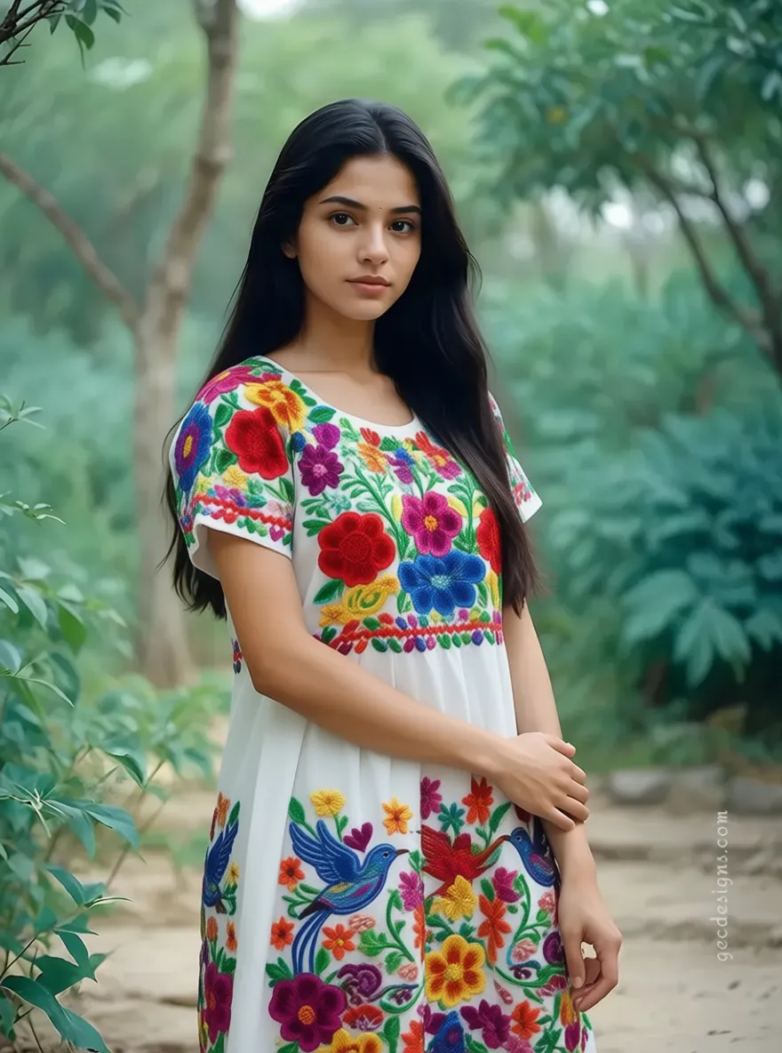Upload her photo and watch her bloom in vibrant Mexican embroidery. Festive colors, floral motifs—instant cultural chic unlocked.