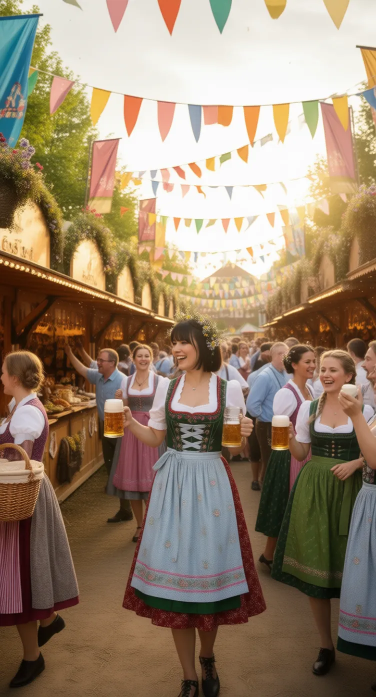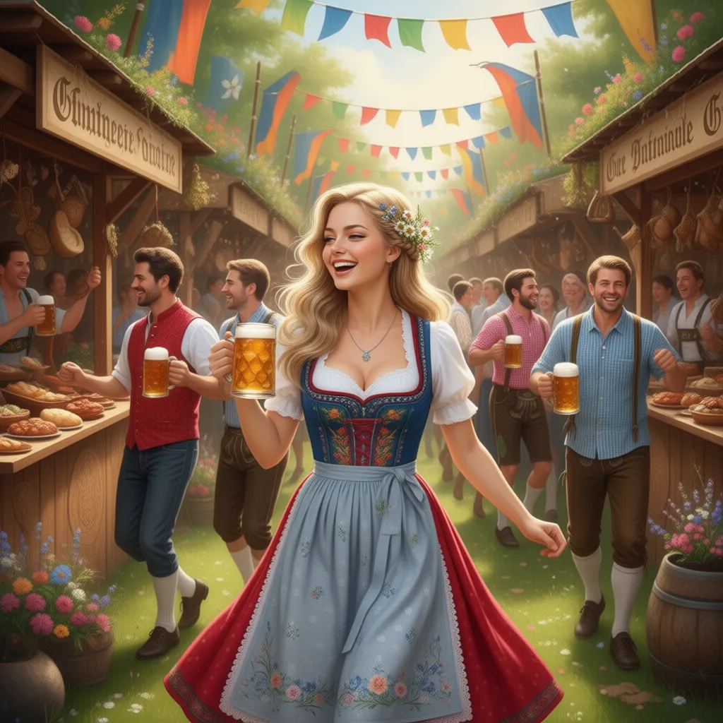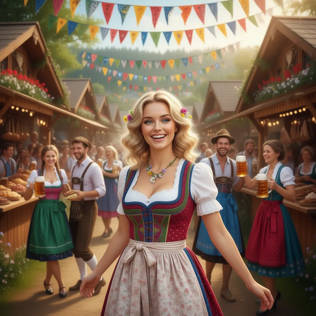 Step into the vibrant world of traditional German celebrations. Experience the charm of a classic Dirndl—crisp white blouse, embroidered bodice, flowing skirt, and a delicately patterned apron. Feel the festive energy as lively folk music fills the air, colorful banners flutter overhead, and joyful crowds gather to dance, celebrate, and share in a timeless cultural heritage. Let every moment capture the spirit of tradition and community.