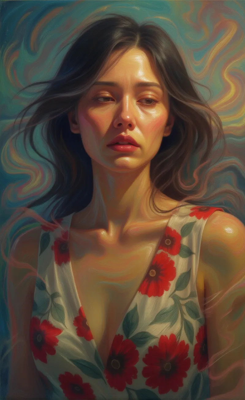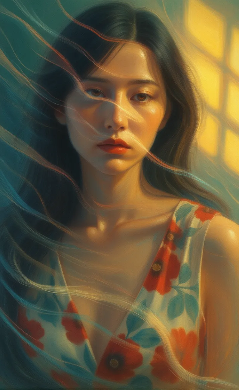 Transform yourself into an abstract emotional artwork that visualizes the person's inner feeling as color, motion, and light.