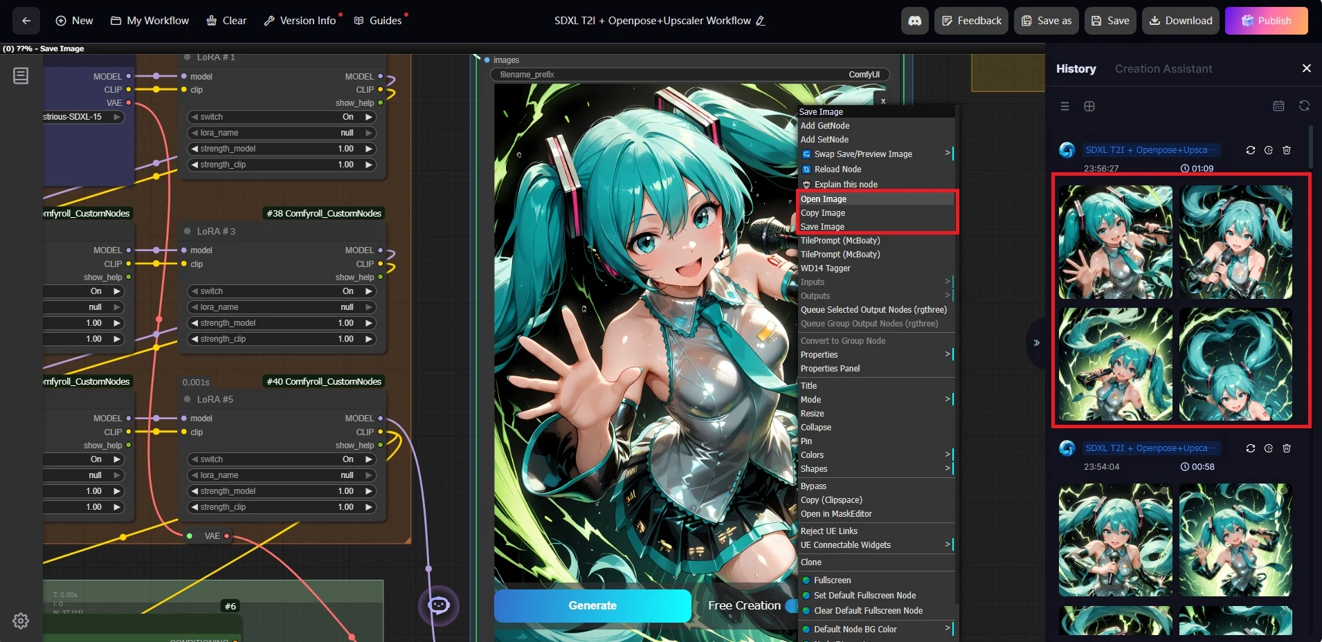 Once generation is complete, the generated image will appear in the central node. You can right-click and select Open Image to save it to your PC, or save the image from the History tab on the right edge of the screen.