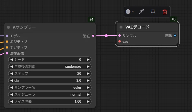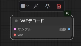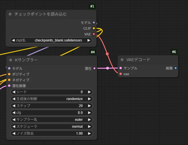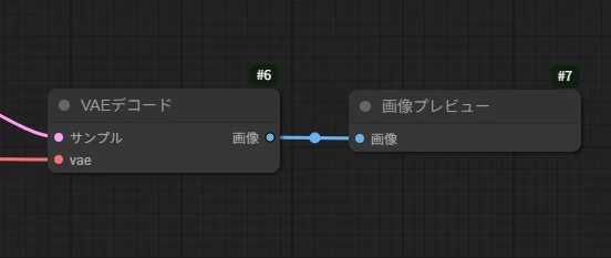 【VAEデコード】の【VAE】の部分には【チェックポイントモデルを読み込む】の【VAE】を接続しておきます。