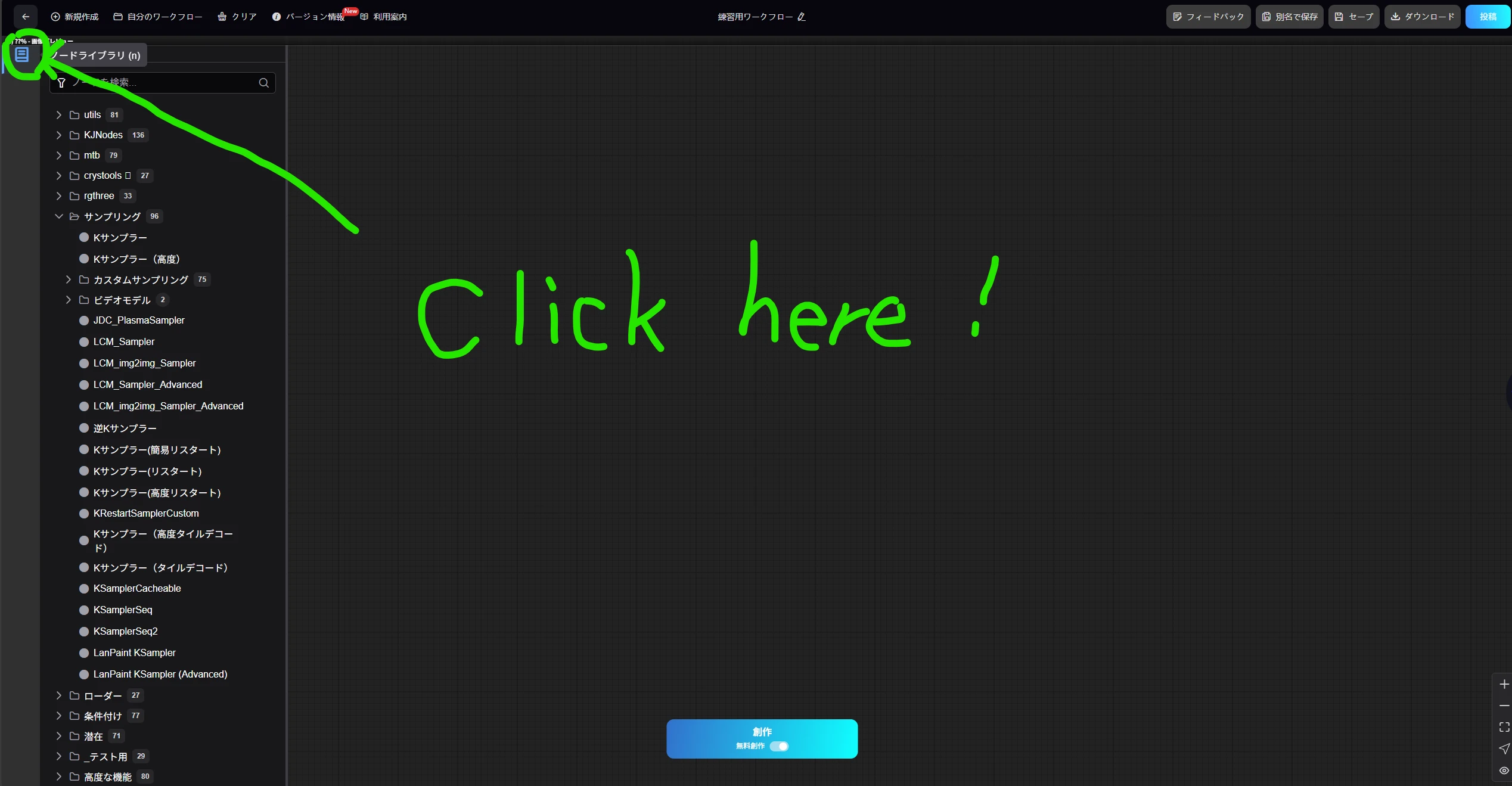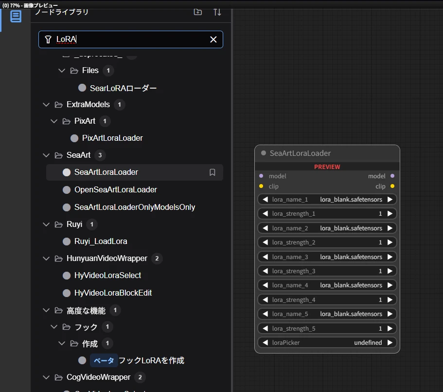 SeaArt上でComfyUI を使用する場合、左上に表示されたノードライブラリから【ノード】検索することも可能です。