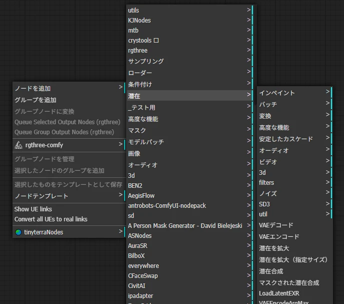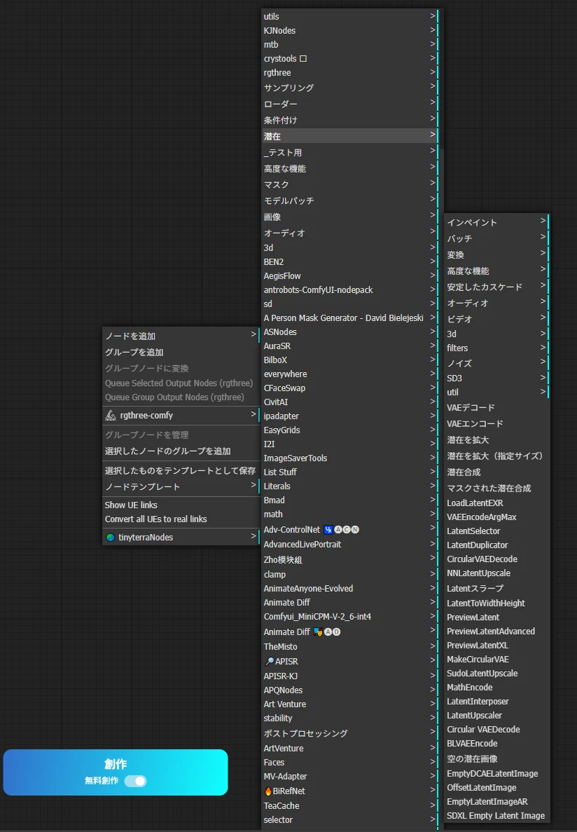 【ノードを追加】⇒【潜在】⇒【空の潜在画像】の順に選択していきます。(下図参照)