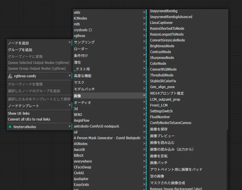 それでは早速チェックポイントモデルを選択する【ノード】を配置します。画面上で右クリックをすると【ノード】選択画面が表示されますので、