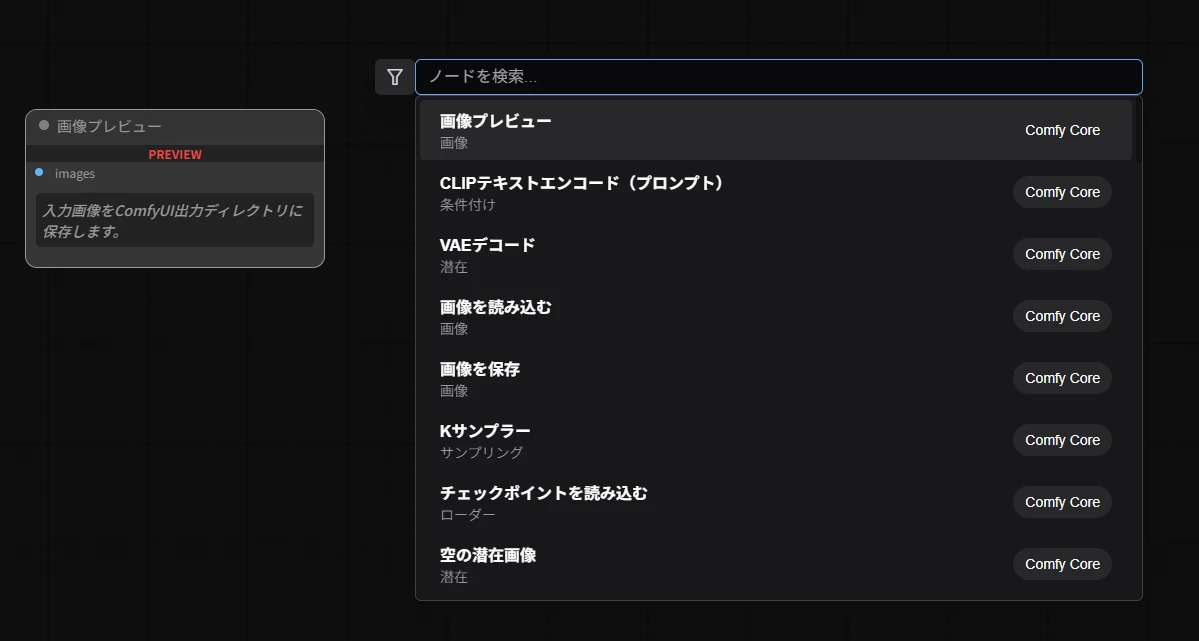 ComfyUI では、これらの【ノード】を組み合わせて【ワークフロー】を完成させることで、ツールとして使用することができるようになります。