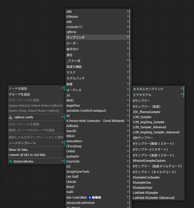 【ノードを追加】⇒【サンプリング】⇒【Kサンプラー】の順に選択していきます。(下図参照)