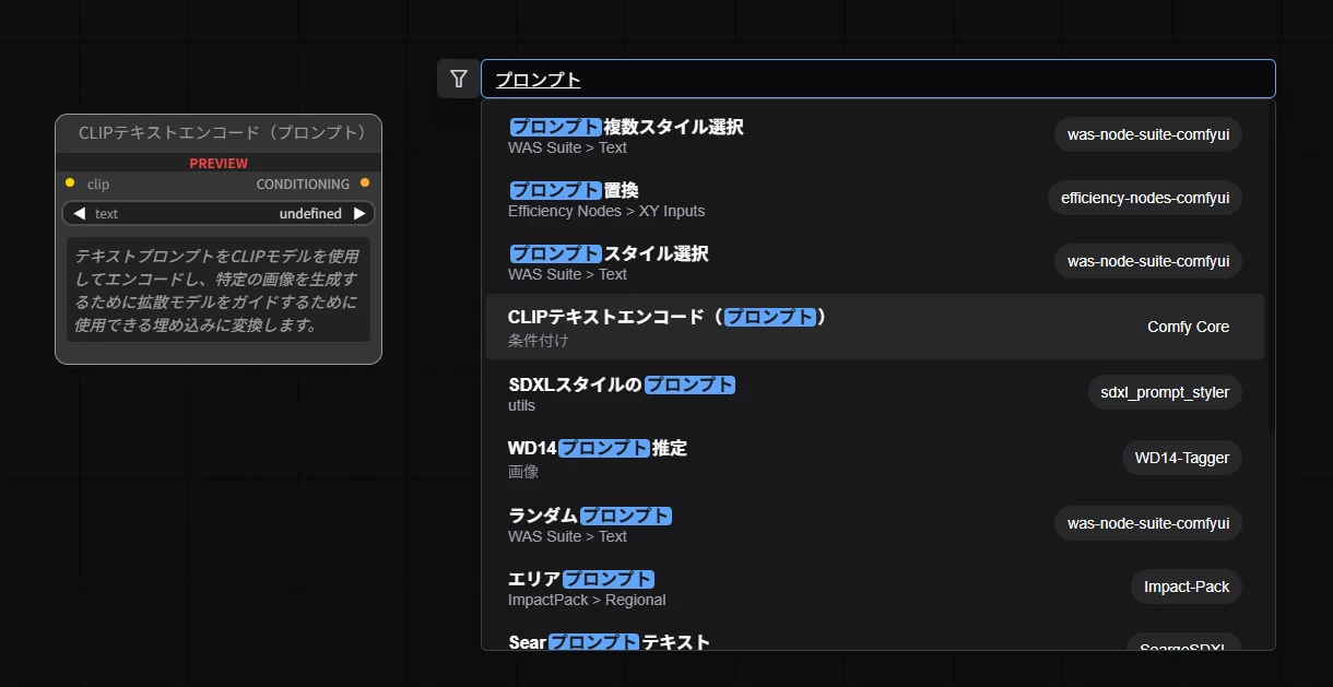 実はすでに使用するノードが表示されているのですが、今回は練習ですので検索窓に「プロンプト」と入力して見てください。すると検索窓の下に「プロンプト」に関連する【ノード】だけが表示されるようになります。
