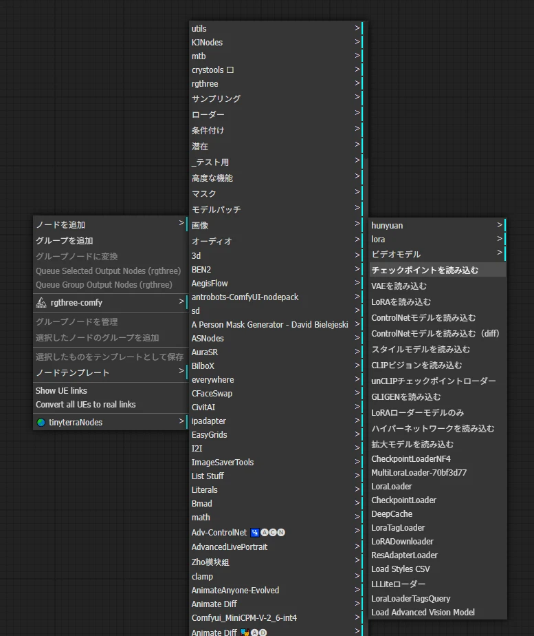 【ノードを追加】⇒【ローダー】⇒【チェックポイントを読み込む】の順に選択していきます。(下図参照)