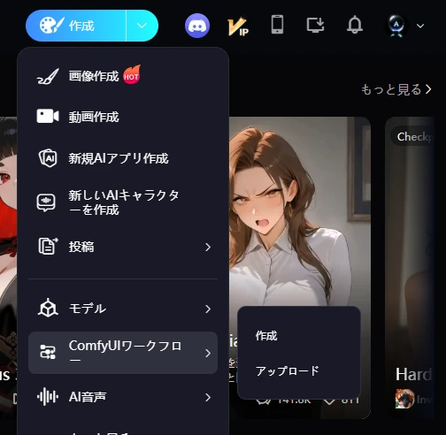 SeaArtでは、【作成】⇒ 【ComfyUIワークフロー】 ⇒ 【作成】の順で画面を表示することができます。(下図参照)