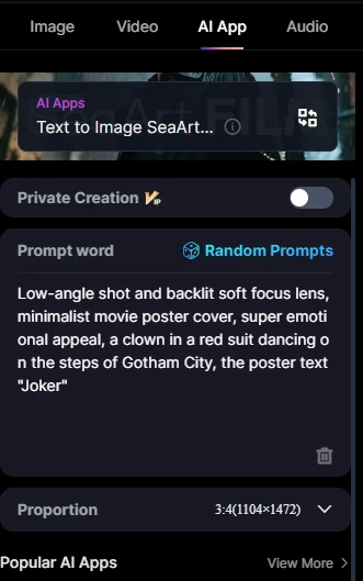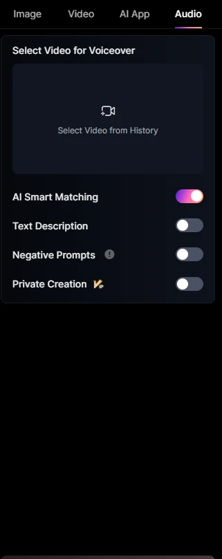 Back to the New Interface, it offers us not to run around the site and create at once and conveniently. The first tab is Video Creation, the second tab is App AI, the third tab is Audio Creation, everything is quite simple and clear. Intuitive interface with no unnecessary settings.