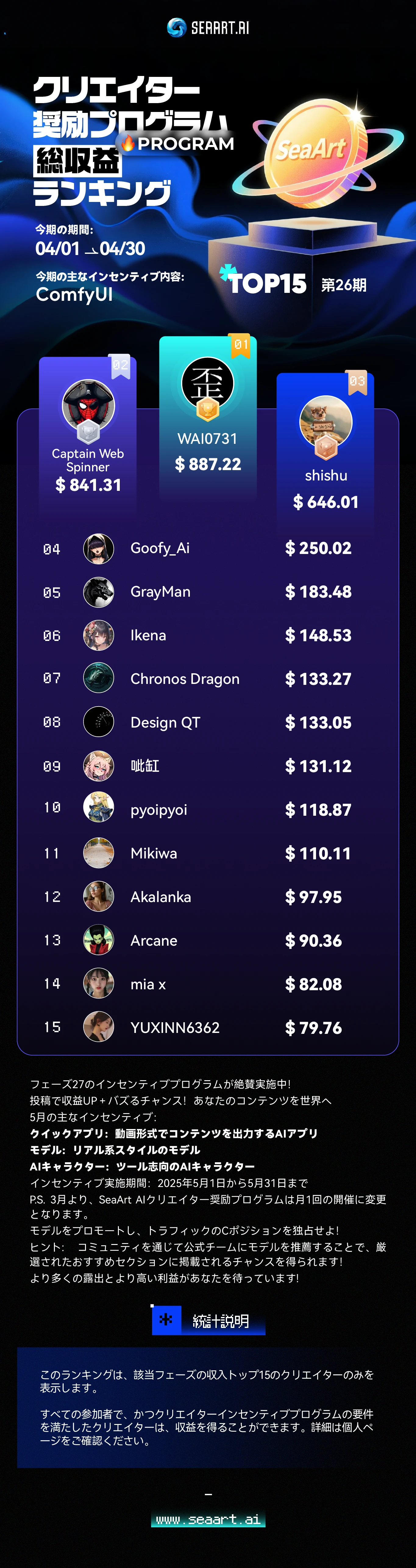 P.S. 3月より、SeaArt AIクリエイター奨励プログラムは月1回の開催に変更となります。