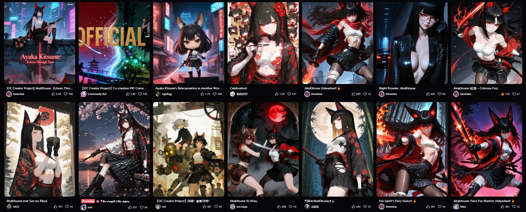 AkaKitsune wasn’t born out of nowhere. She evolved from a customizable game character she had refined for years. When SeaArt introduced the integration of OC, AI Character, AI Novel, and LoRA, she immediately decided to formalize her existence and build her universe.