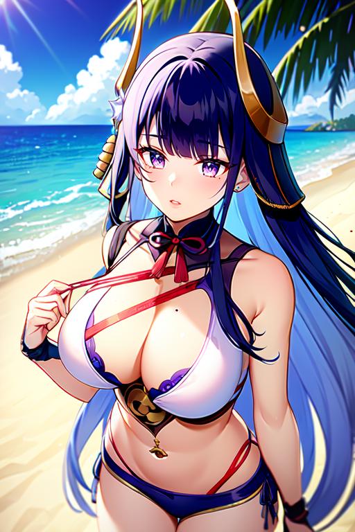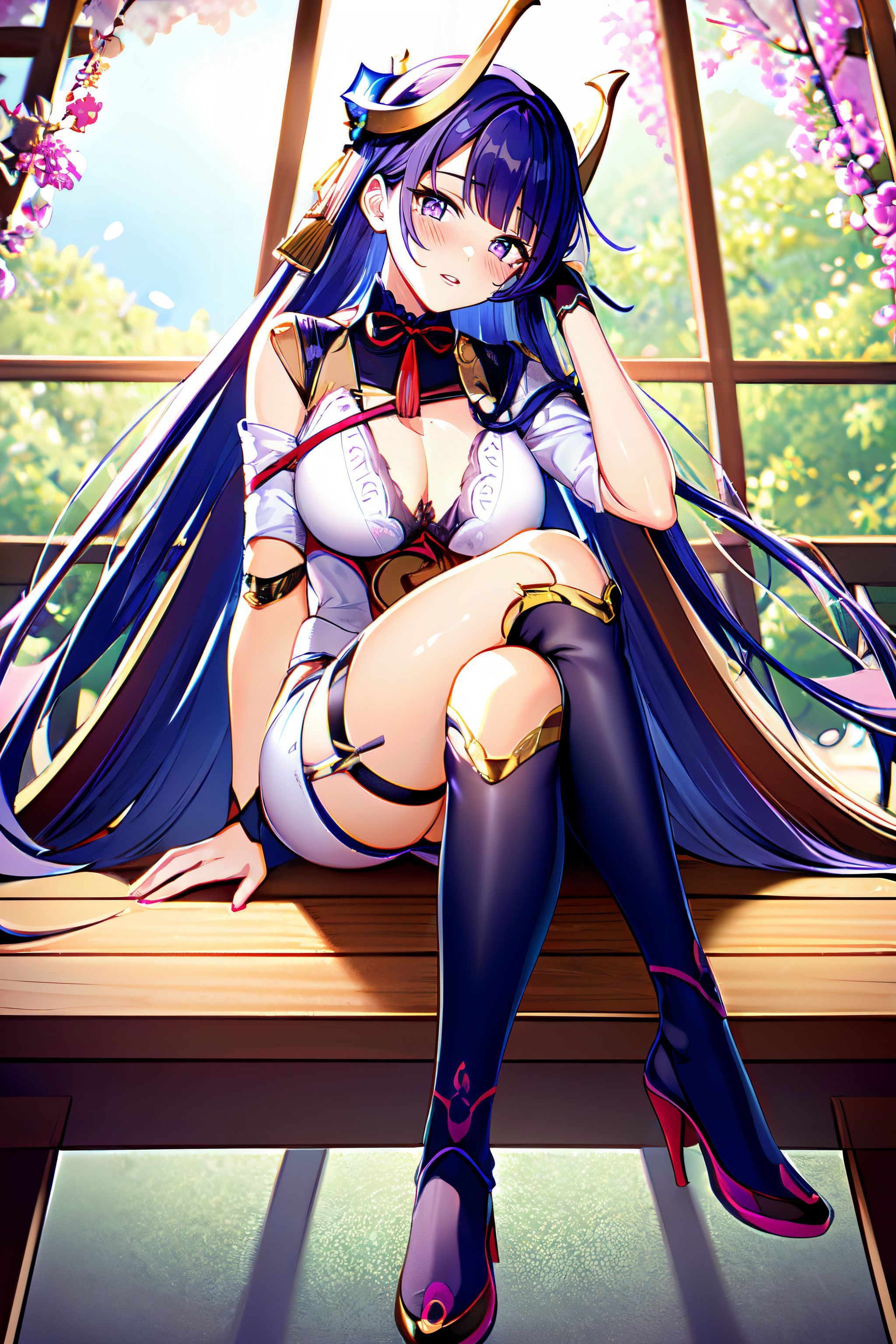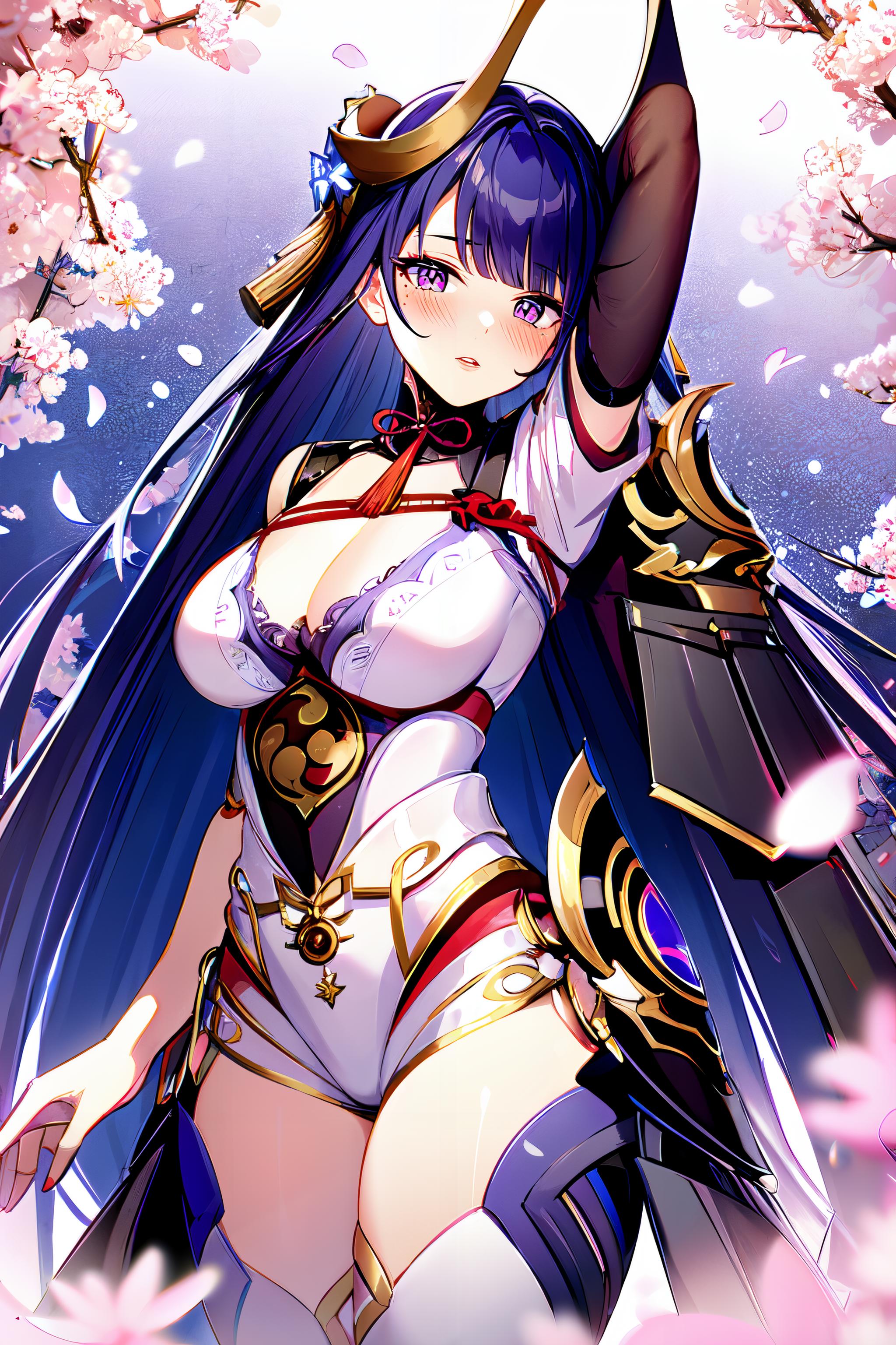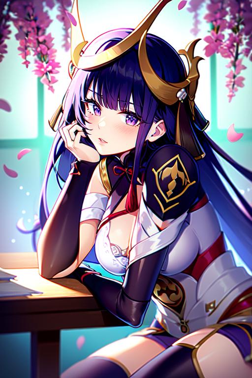 raiden shogun boss, long hair, purple hair, purple eyes, armor, hair ornament, horns, shoulder armor, purple thighhighs, mole, mole under eye