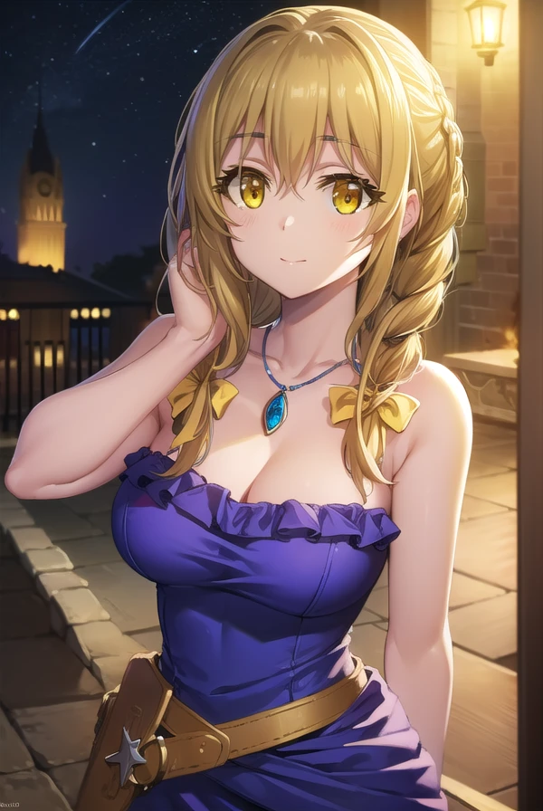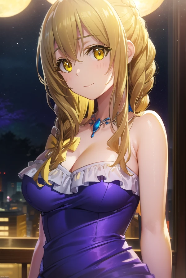 dress, cleavage, bare shoulders, jewelry, collarbone, necklace, strapless, blue dress, strapless dress, purple dress,