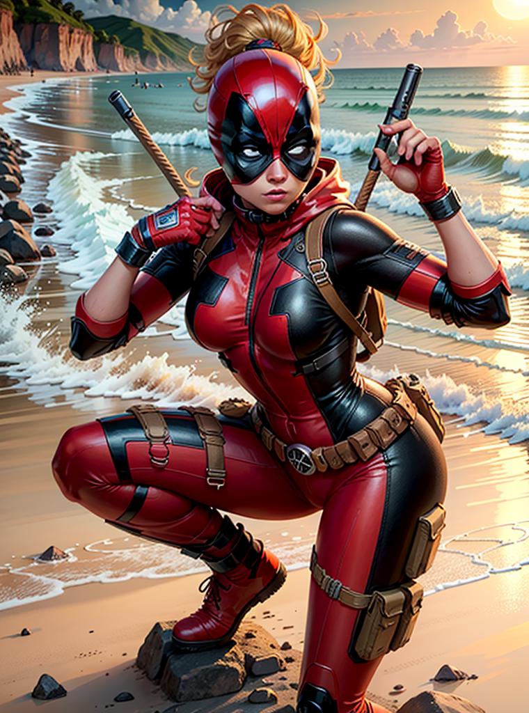 REMEMBER to follow the social networks and ask for your own model. Hello, guys. This time you'll go crazy with LadyPool, the female and zany version of the famous Marvel character Deadpool. I know you'll love experimenting with the model ;D. Use the model with a strength of <1.0 - 0.5>. Use the activation keyword "LadyPool" and her characteristics "superhero, ????????, red leotard, belt, gun, hood, long hair, ponytail, red mask, covered face." Follow me for more models ;D.