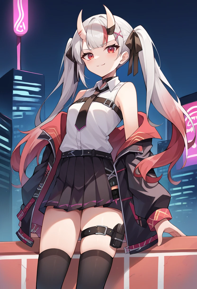 AyameCasual, oni horns, long hair, hair ribbon, x hair ornament, twintails, white shirt, sleeveless shirt, chest belt, black necktie, black skirt, pleated skirt, black thighhighs, thigh strap, black jacket, open jacket, off shoulder, black choker