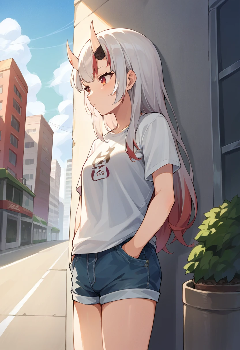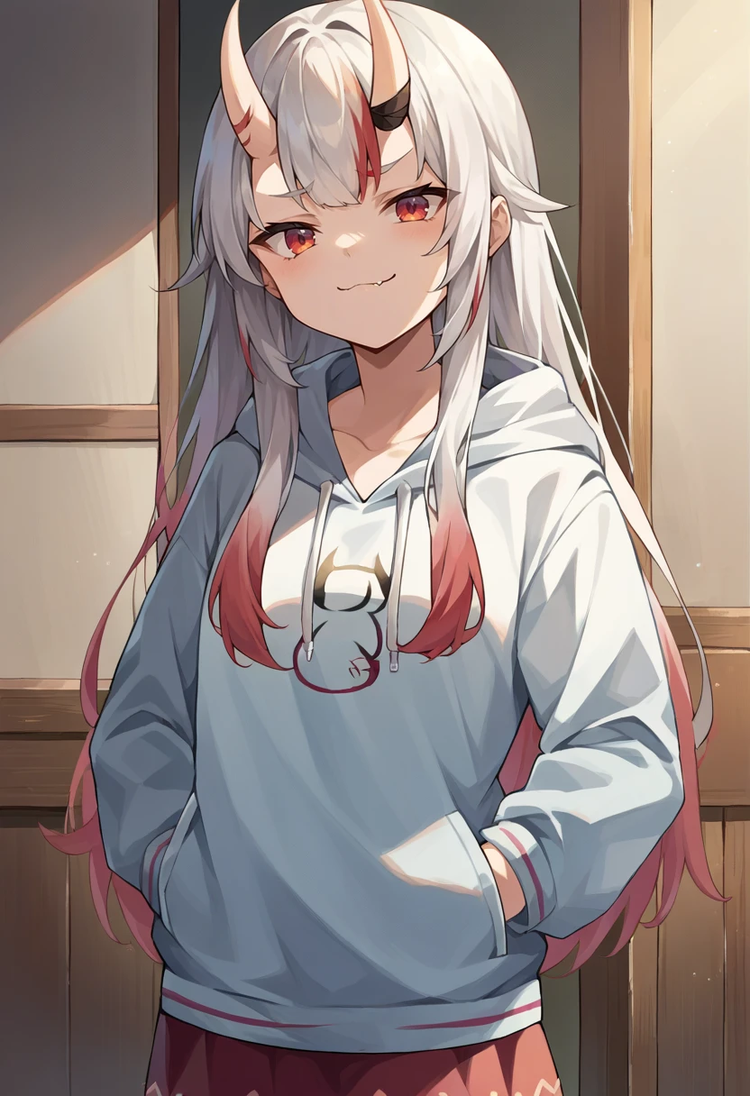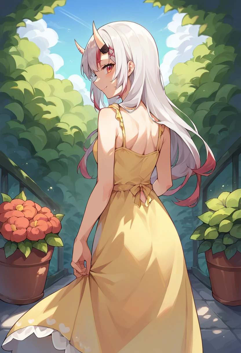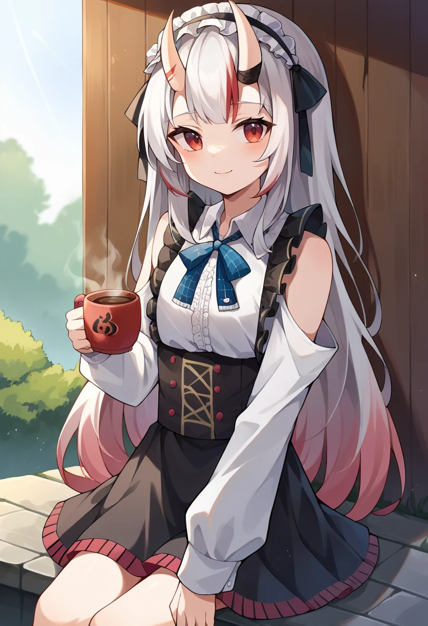 AyameGirly, white hair, oni horns, long hair, frilled hairband, black hair ribbon, white shirt, collared shirt, long sleeves, shoulder cutouts, black skirt, high-waist skirt, blue bow