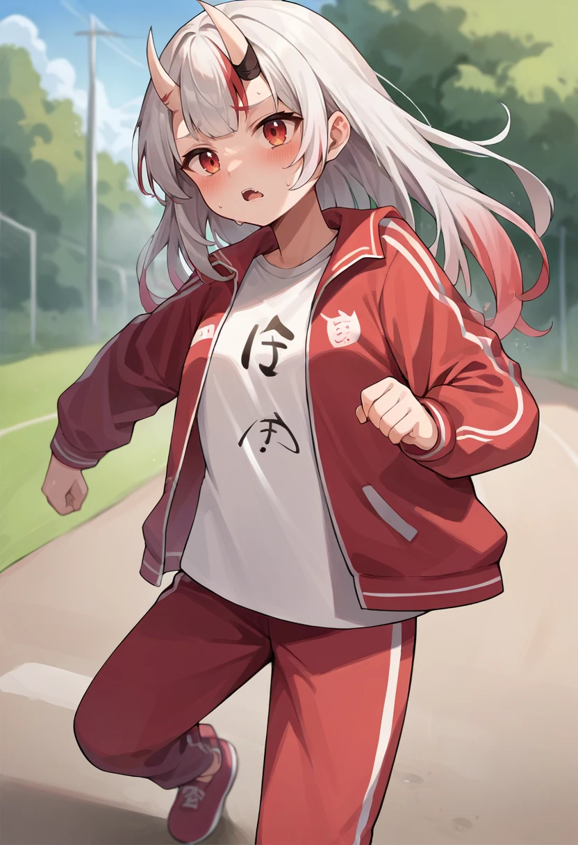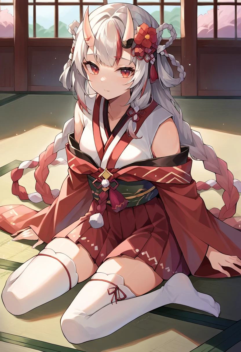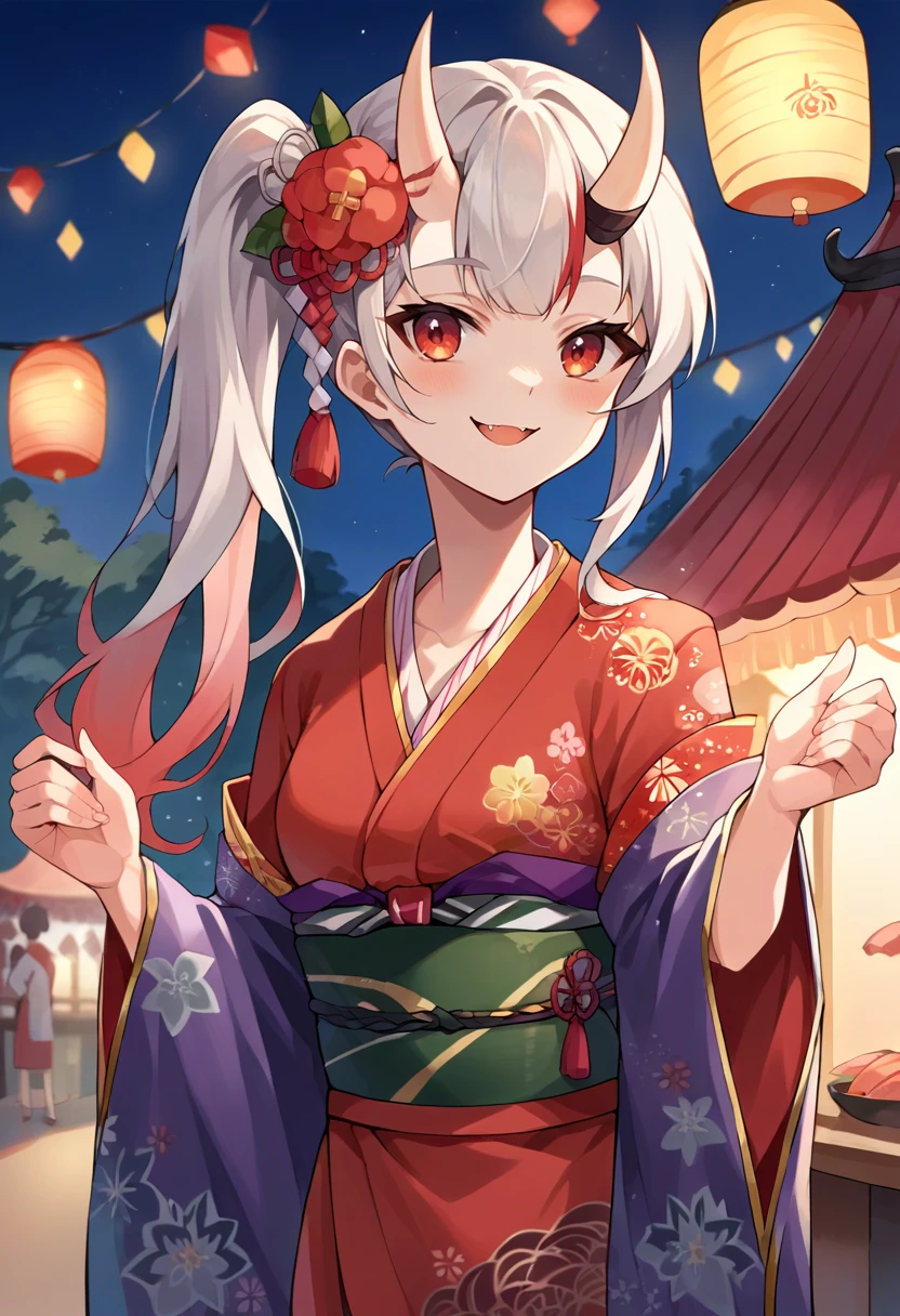 AyameNewYears, oni horns, long hair, side ponytail, red kimono, floral print, hair flower, sash, haori