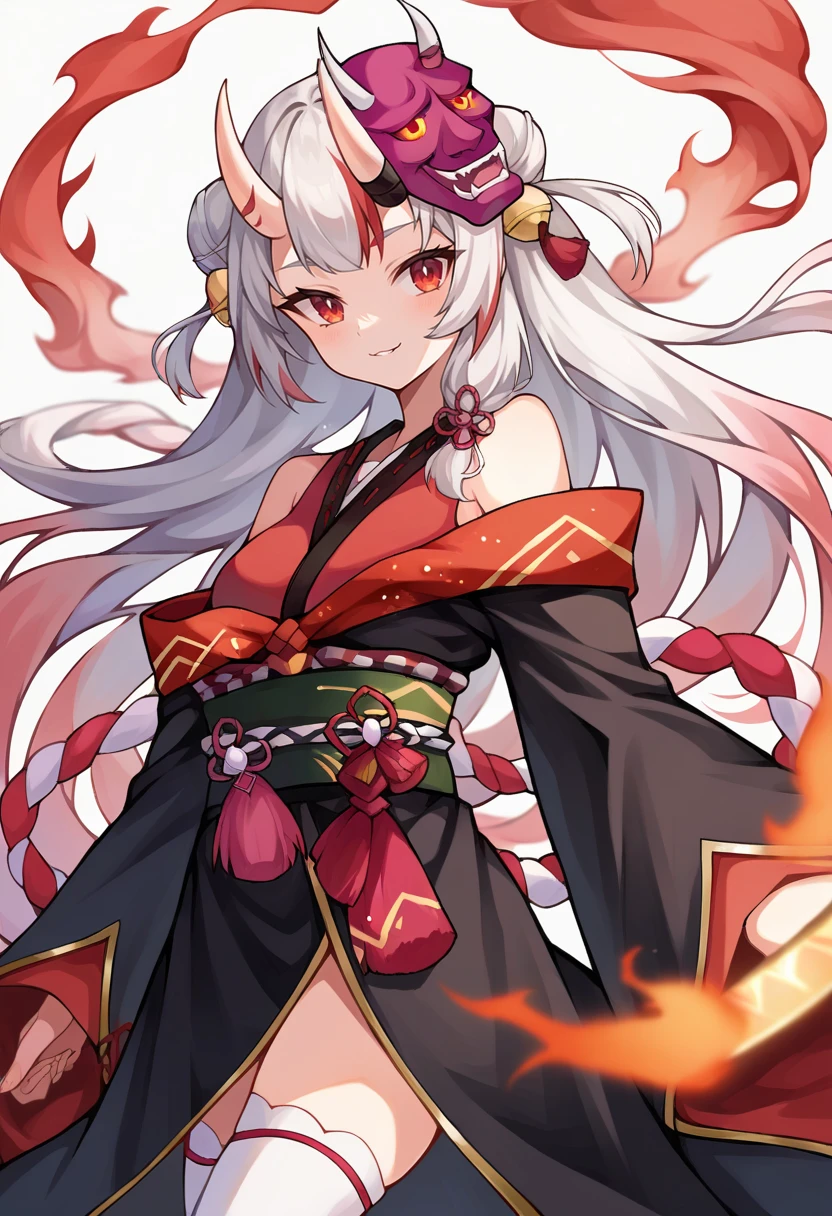 AyameBase, oni horns, long hair, double bun, black kimono, short kimono, hair bell, obi, shimenawa, white thighhighs, bare shoulders, long sleeves, oni mask, mask on head