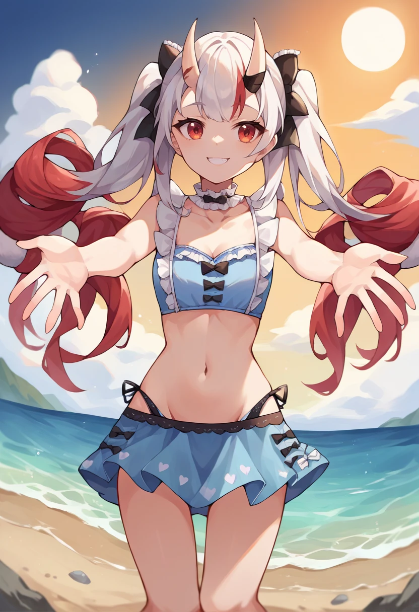 AyameSummer, oni horns, twintails, blue bikini, frilled bikini, bikini skirt, hair bow, black bow, frilled choker